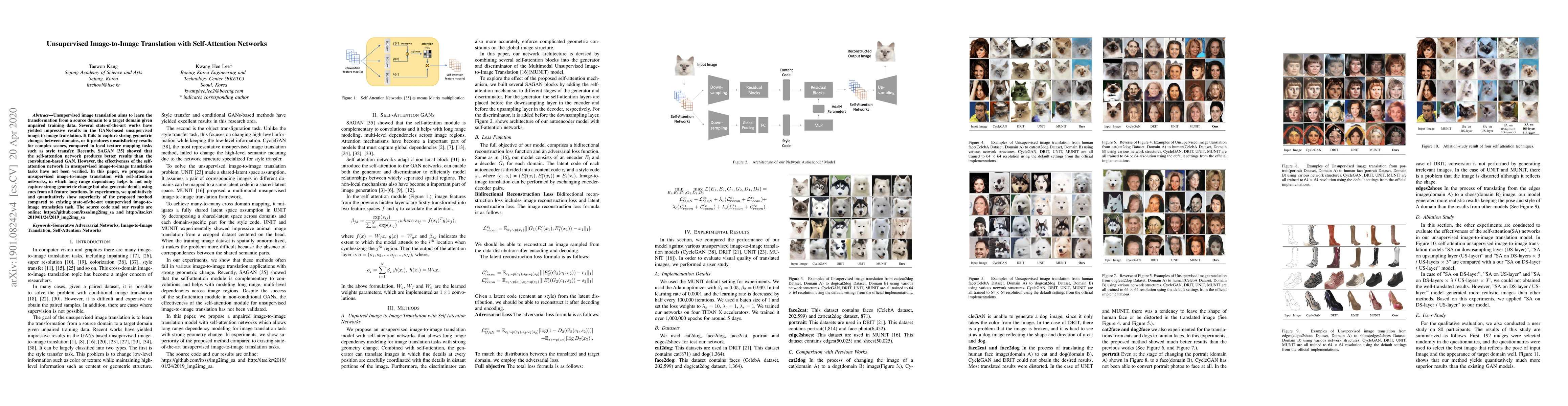 This paper proposes an unsupervised image-to-image translation method using self-attention networks to better capture geometric changes and generate details, outperforming existing state-of-the-art methods both qualitatively and quantitatively. The effectiveness of self-attention in this context is demonstrated through extensive experiments.