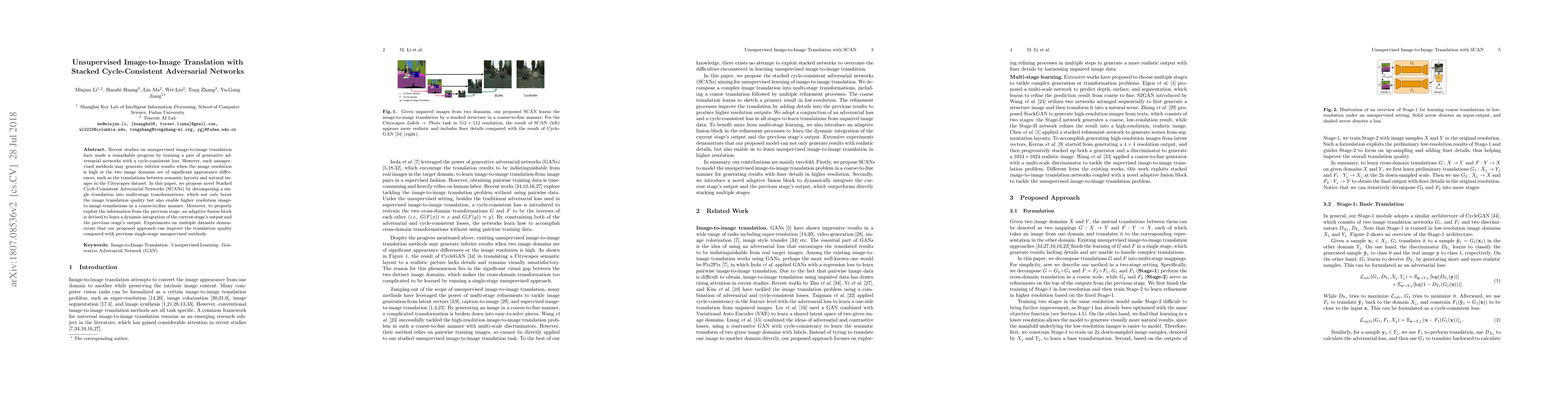 This paper introduces Stacked Cycle-Consistent Adversarial Networks (SCANs) to enhance unsupervised image-to-image translation, particularly for high-resolution images and domains with significant appearance differences. The method decomposes translation into multi-stage transformations, improving translation quality through an adaptive fusion block.