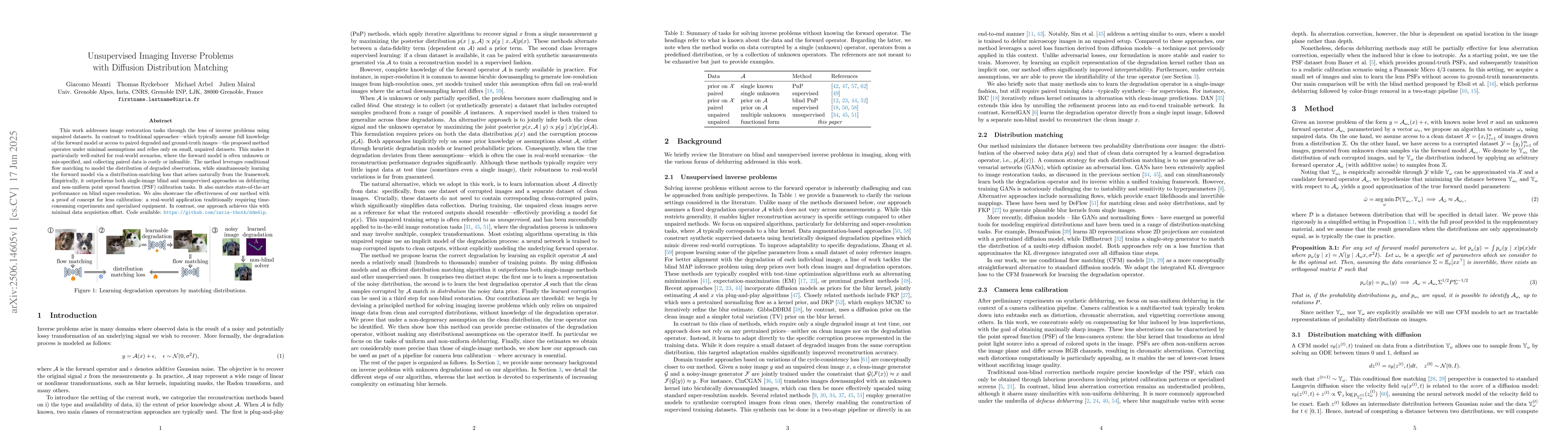 This work addresses image restoration tasks through the lens of inverse problems using unpaired datasets. In contrast to traditional approaches -- which typically assume full knowledge of the forward model or access to paired degraded and ground-truth images -- the proposed method operates under minimal assumptions and relies only on small, unpaired datasets. This makes it particularly well-suited for real-world scenarios, where the forward model is often unknown or misspecified, and collecting paired data is costly or infeasible. The method leverages conditional flow matching to model the distribution of degraded observations, while simultaneously learning the forward model via a distribution-matching loss that arises naturally from the framework. Empirically, it outperforms both single-image blind and unsupervised approaches on deblurring and non-uniform point spread function (PSF) calibration tasks. It also matches state-of-the-art performance on blind super-resolution. We also showcase the effectiveness of our method with a proof of concept for lens calibration: a real-world application traditionally requiring time-consuming experiments and specialized equipment. In contrast, our approach achieves this with minimal data acquisition effort.