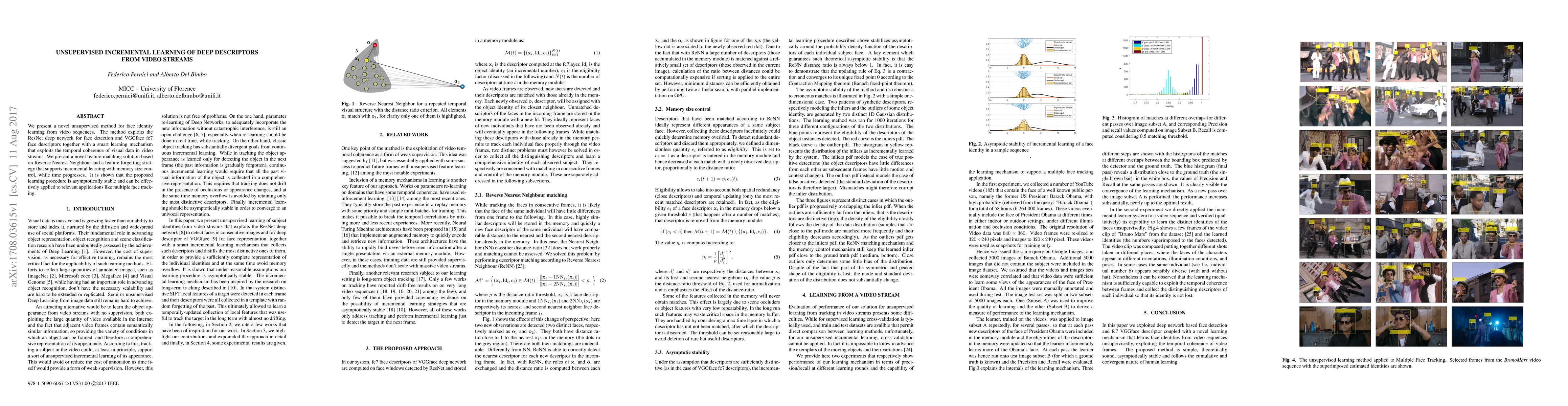 This paper introduces an unsupervised method for learning face identities from video streams using ResNet for detection and VGGface descriptors. It employs a temporal coherence-based learning mechanism with a Reverse Nearest Neighbour feature matching and a forgetting strategy for incremental learning, demonstrating asymptotic stability and applicability to multiple face tracking.