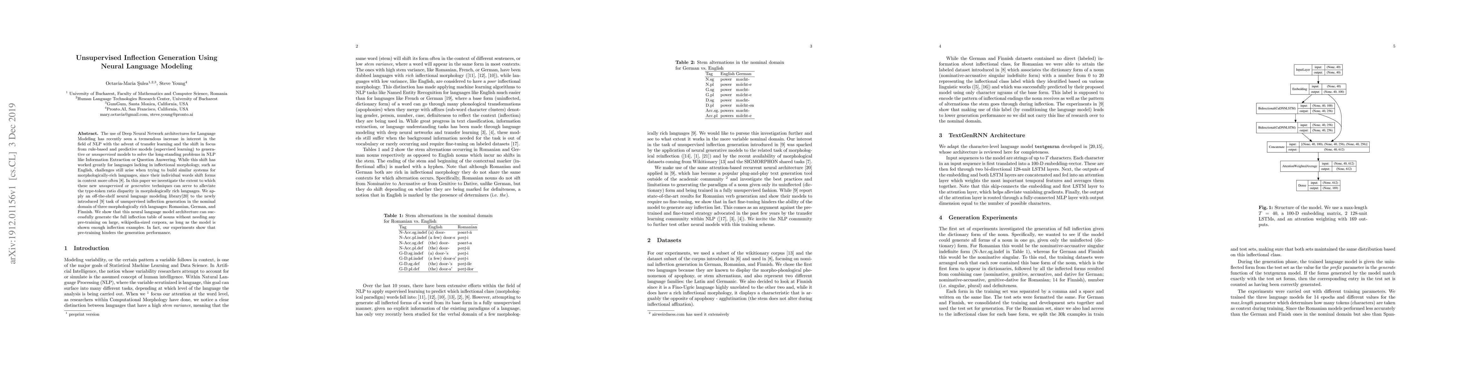 This paper demonstrates that neural language modeling can generate inflection tables for morphologically rich languages like Romanian, German, and Finnish without pre-training on large corpora, improving performance over training alone.