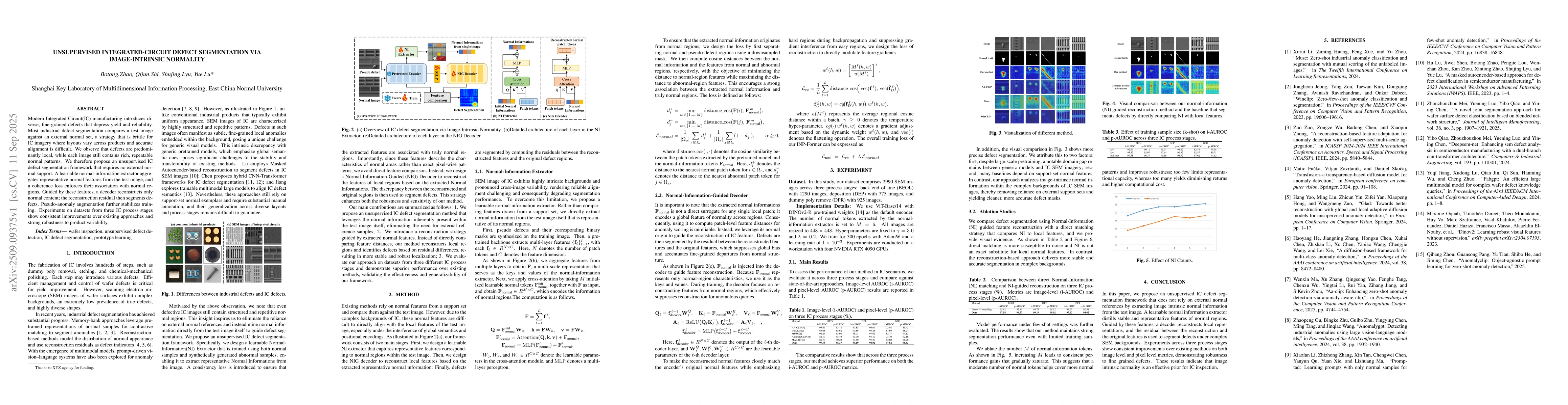 Modern Integrated-Circuit(IC) manufacturing introduces diverse, fine-grained defects that depress yield and reliability. Most industrial defect segmentation compares a test image against an external normal set, a strategy that is brittle for IC imagery where layouts vary across products and accurate alignment is difficult. We observe that defects are predominantly local, while each image still contains rich, repeatable normal patterns. We therefore propose an unsupervised IC defect segmentation framework that requires no external normal support. A learnable normal-information extractor aggregates representative normal features from the test image, and a coherence loss enforces their association with normal regions. Guided by these features, a decoder reconstructs only normal content; the reconstruction residual then segments defects. Pseudo-anomaly augmentation further stabilizes training. Experiments on datasets from three IC process stages show consistent improvements over existing approaches and strong robustness to product variability.