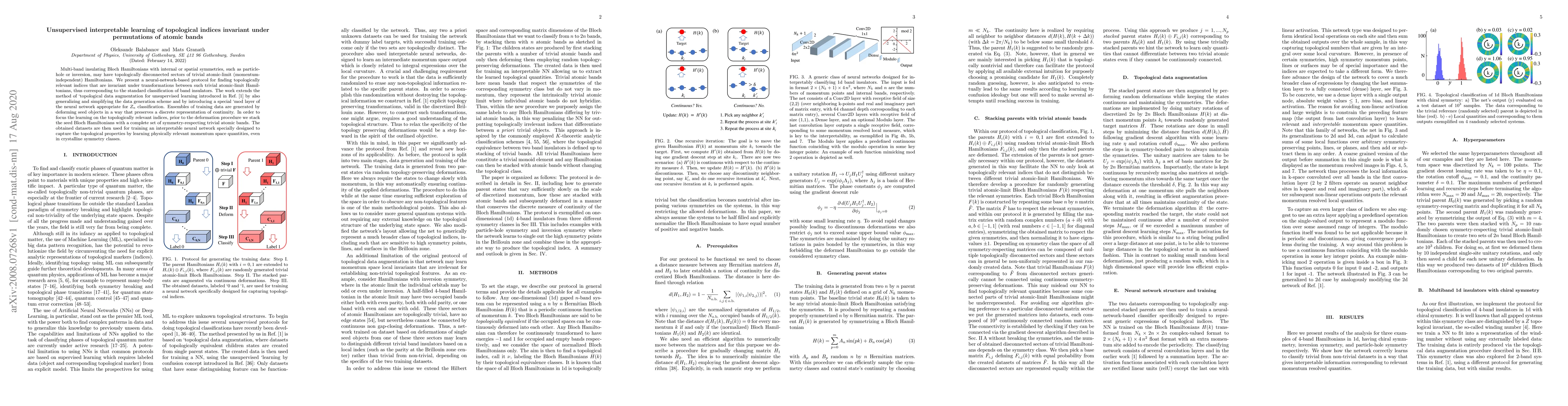 Multi-band insulating Bloch Hamiltonians with internal or spatial symmetries, such as particle-hole or inversion, may have topologically disconnected sectors of trivial atomic-limit (momentum-independent) Hamiltonians. We present a neural-network-based protocol for finding topologically relevant indices that are invariant under transformations between such trivial atomic-limit Hamiltonians, thus corresponding to the standard classification of band insulators. The work extends the method of "topological data augmentation" for unsupervised learning introduced in Ref. [1] by also generalizing and simplifying the data generation scheme and by introducing a special "mod" layer of the neural network appropriate for $Z_n$ classification. Ensembles of training data are generated by deforming seed objects in a way that preserves a discrete representation of continuity. In order to focus the learning on the topologically relevant indices, prior to the deformation procedure we stack the seed Bloch Hamiltonians with a complete set of symmetry-respecting trivial atomic bands. The obtained datasets are then used for training an interpretable neural network specially designed to capture the topological properties by learning physically relevant momentum space quantities, even in crystalline symmetry classes.