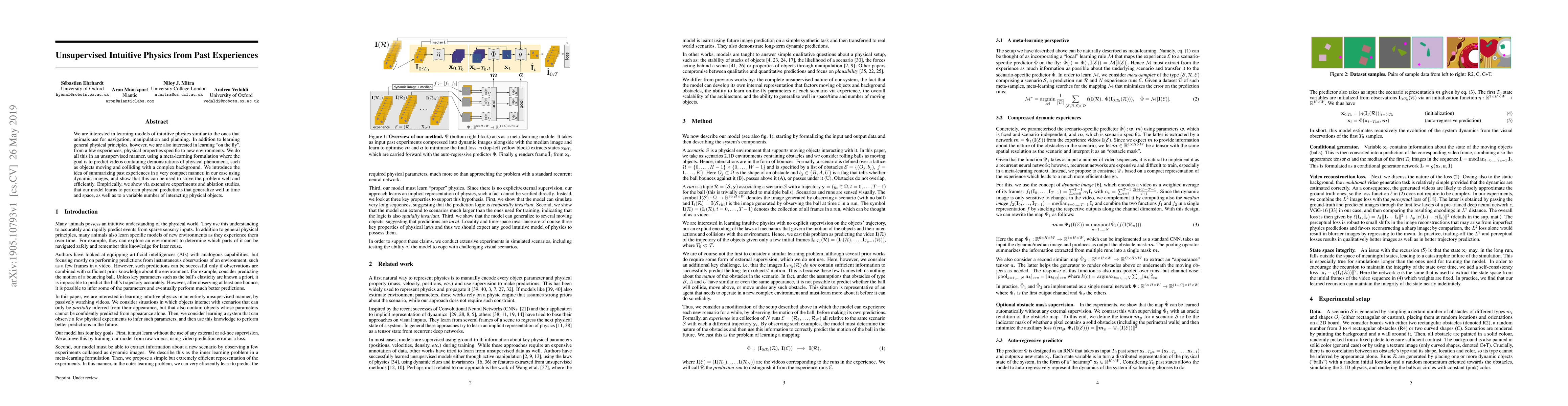 We are interested in learning models of intuitive physics similar to the ones that animals use for navigation, manipulation and planning. In addition to learning general physical principles, however, we are also interested in learning ``on the fly'', from a few experiences, physical properties specific to new environments. We do all this in an unsupervised manner, using a meta-learning formulation where the goal is to predict videos containing demonstrations of physical phenomena, such as objects moving and colliding with a complex background. We introduce the idea of summarizing past experiences in a very compact manner, in our case using dynamic images, and show that this can be used to solve the problem well and efficiently. Empirically, we show via extensive experiments and ablation studies, that our model learns to perform physical predictions that generalize well in time and space, as well as to a variable number of interacting physical objects.