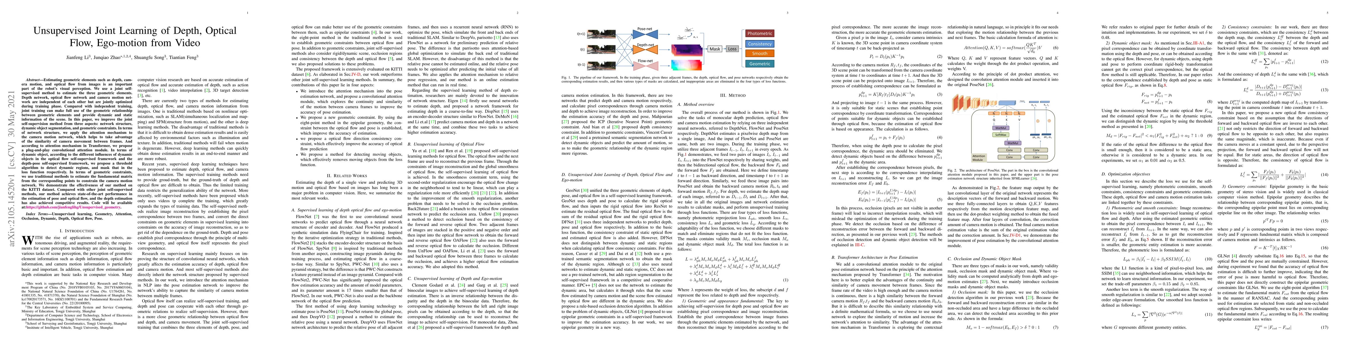 This paper proposes an unsupervised joint learning method to estimate depth, optical flow, and ego-motion from video. It improves joint self-supervision through enhanced network structure, dynamic object segmentation, and geometric constraints, achieving state-of-the-art performance on the KITTI dataset.