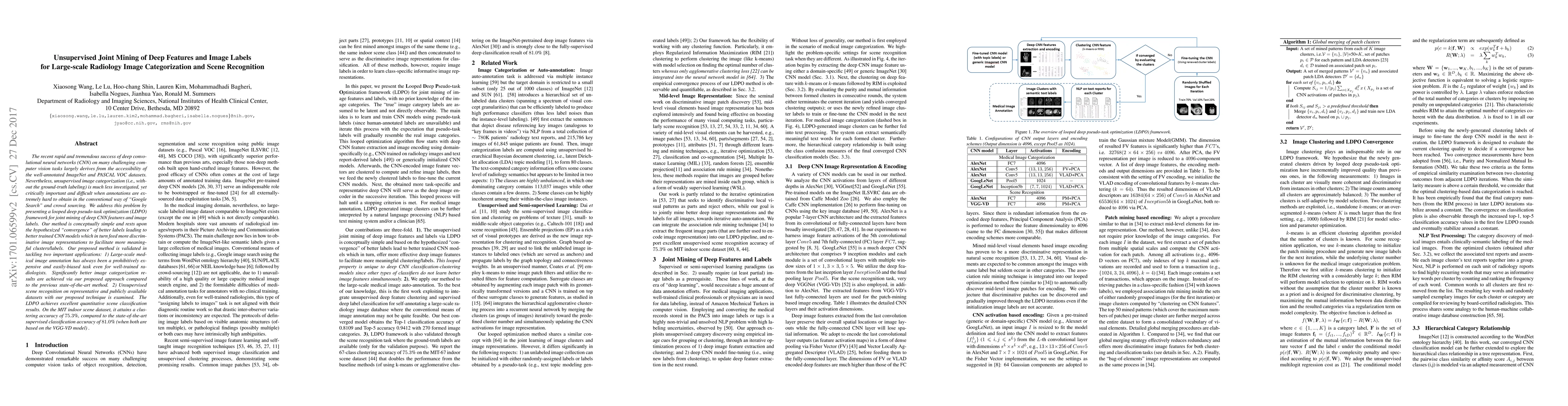 This paper proposes an unsupervised framework called Looped Deep Pseudo-Task Optimization (LDPO) to jointly mine deep CNN features and image labels without ground-truth annotations. The LDPO iteratively refines image labels and CNN models, achieving superior results in large-scale medical image categorization and unsupervised scene recognition on the MIT indoor dataset.