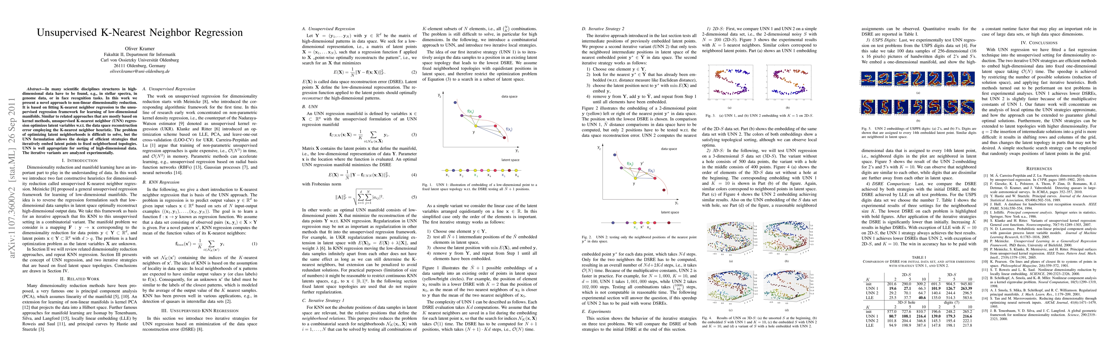 In many scientific disciplines structures in high-dimensional data have to be found, e.g., in stellar spectra, in genome data, or in face recognition tasks. In this work we present a novel approach to non-linear dimensionality reduction. It is based on fitting K-nearest neighbor regression to the unsupervised regression framework for learning of low-dimensional manifolds. Similar to related approaches that are mostly based on kernel methods, unsupervised K-nearest neighbor (UNN) regression optimizes latent variables w.r.t. the data space reconstruction error employing the K-nearest neighbor heuristic. The problem of optimizing latent neighborhoods is difficult to solve, but the UNN formulation allows the design of efficient strategies that iteratively embed latent points to fixed neighborhood topologies. UNN is well appropriate for sorting of high-dimensional data. The iterative variants are analyzed experimentally.