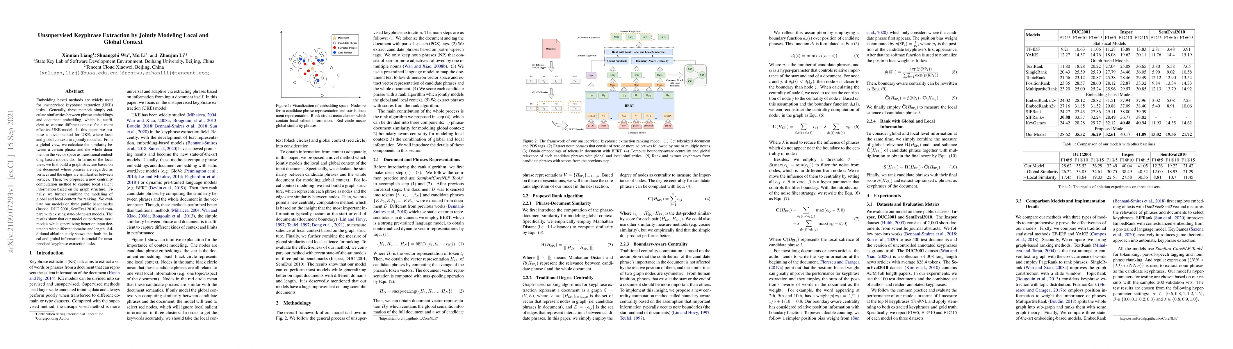 This paper proposes a novel method for unsupervised keyphrase extraction that jointly models local and global contexts to capture more effective information from documents. It outperforms existing state-of-the-art models while generalizing better on diverse input documents.