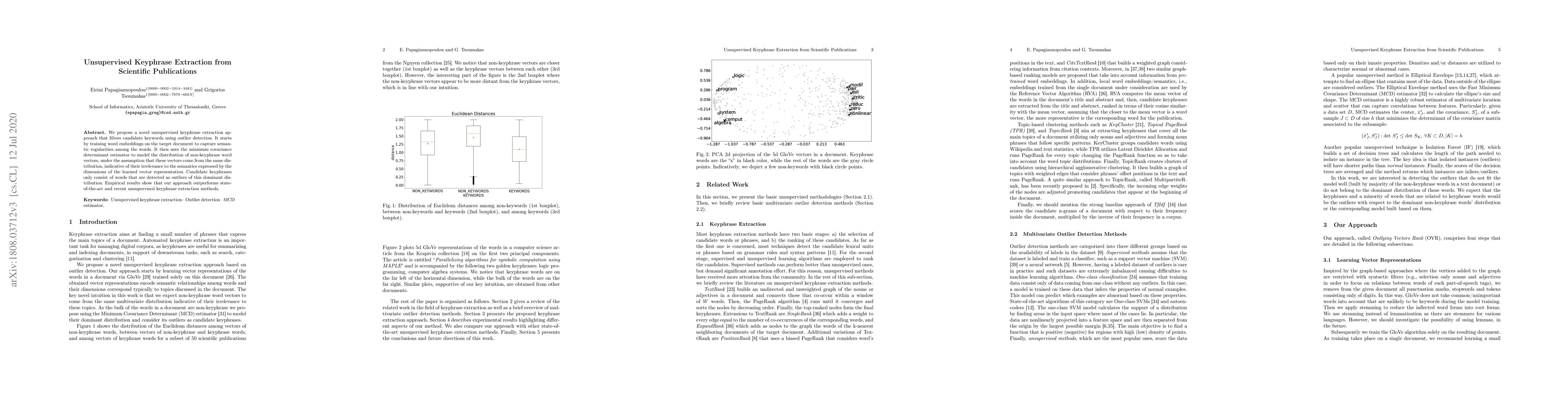 This paper introduces an unsupervised method for keyphrase extraction from scientific texts by training word embeddings and using outlier detection to identify keywords, achieving superior performance compared to existing techniques. The approach models non-keyphrase word vectors to filter out irrelevant terms, emphasizing semantic relevance.