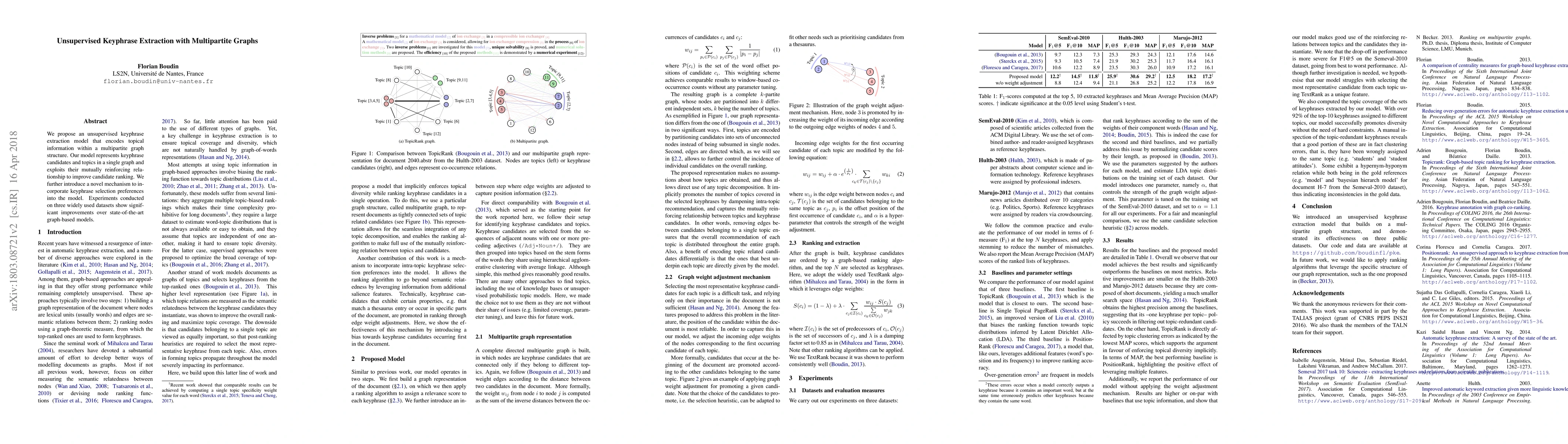 The paper presents an unsupervised keyphrase extraction model using a multipartite graph to encode topical information, improving candidate ranking through mutual reinforcement. Experiments demonstrate significant performance gains over existing graph-based methods on three datasets.