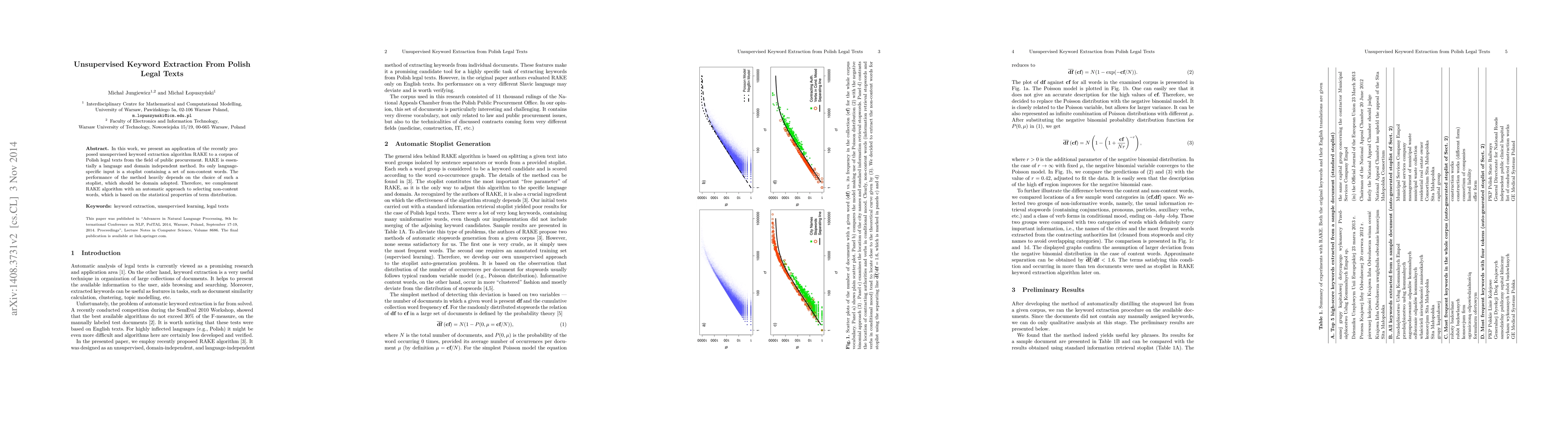 In this work, we present an application of the recently proposed unsupervised keyword extraction algorithm RAKE to a corpus of Polish legal texts from the field of public procurement. RAKE is essentially a language and domain independent method. Its only language-specific input is a stoplist containing a set of non-content words. The performance of the method heavily depends on the choice of such a stoplist, which should be domain adopted. Therefore, we complement RAKE algorithm with an automatic approach to selecting non-content words, which is based on the statistical properties of term distribution.