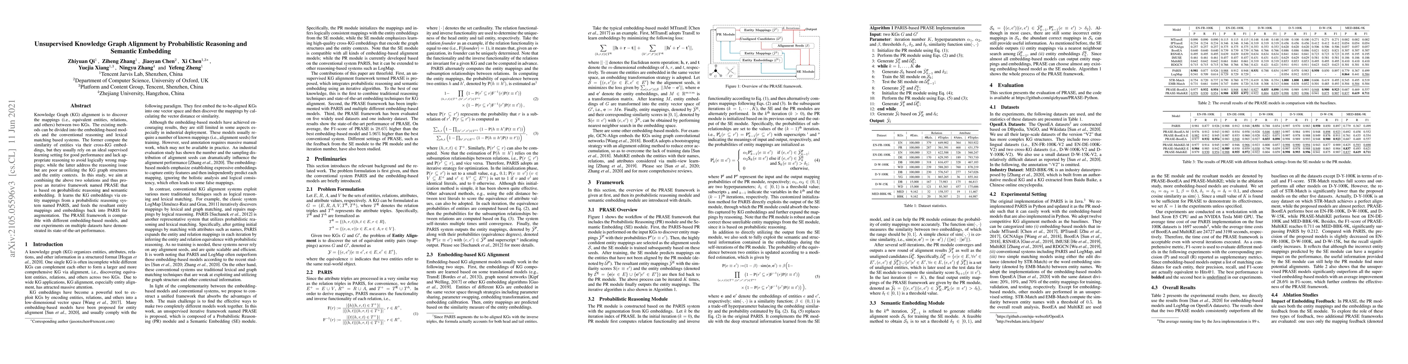 This paper proposes an iterative framework called PRASE for unsupervised Knowledge Graph alignment, combining probabilistic reasoning and semantic embedding to improve entity mappings. PRASE leverages PARIS for probabilistic reasoning and iteratively refines embeddings, achieving state-of-the-art performance on multiple datasets.