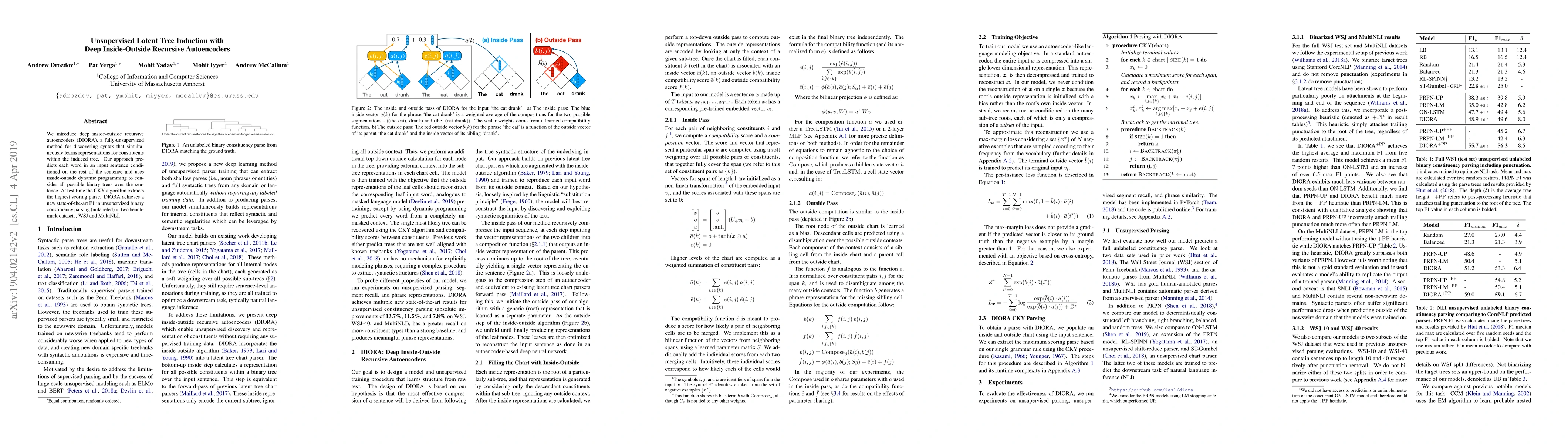 This paper presents DIORA, a deep unsupervised method for inducing latent tree structures in sentences, achieving state-of-the-art F1 scores in unlabeled binary constituency parsing on WSJ and MultiNLI datasets. DIORA uses recursive autoencoders to learn representations and inside-outside dynamic programming to explore all possible binary trees.