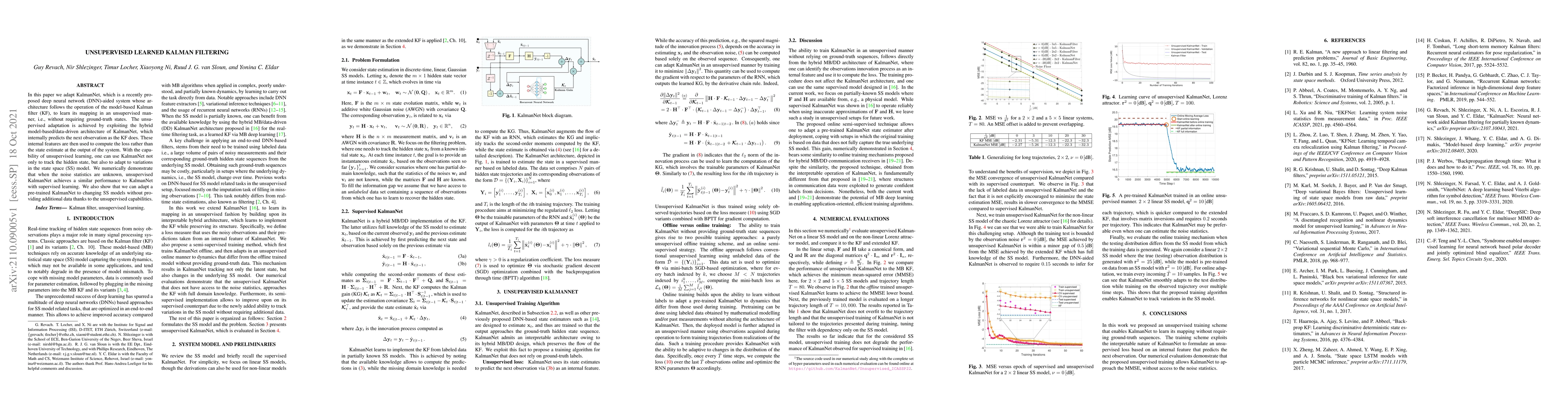 In this paper we adapt KalmanNet, which is a recently pro-posed deep neural network (DNN)-aided system whose architecture follows the operation of the model-based Kalman filter (KF), to learn its mapping in an unsupervised manner, i.e., without requiring ground-truth states. The unsupervised adaptation is achieved by exploiting the hybrid model-based/data-driven architecture of KalmanNet, which internally predicts the next observation as the KF does. These internal features are then used to compute the loss rather than the state estimate at the output of the system. With the capability of unsupervised learning, one can use KalmanNet not only to track the hidden state, but also to adapt to variations in the state space (SS) model. We numerically demonstrate that when the noise statistics are unknown, unsupervised KalmanNet achieves a similar performance to KalmanNet with supervised learning. We also show that we can adapt a pre-trained KalmanNet to changing SS models without providing additional data thanks to the unsupervised capabilities.