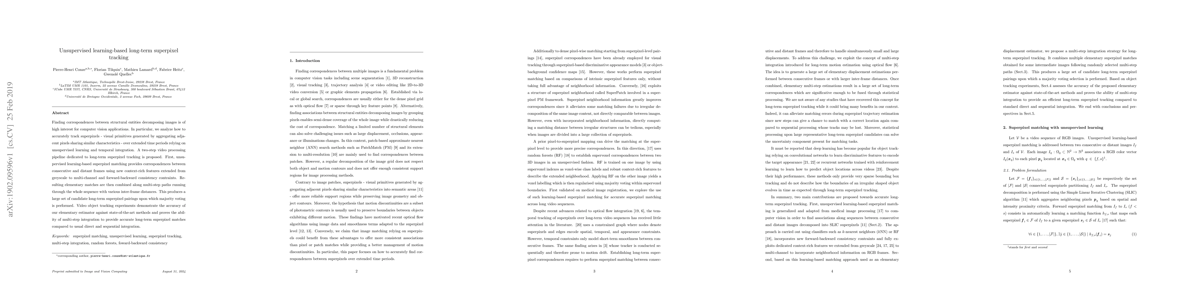 This paper presents a two-step unsupervised learning method for long-term superpixel tracking in video sequences. It introduces context-rich features and forward-backward consistency constraints for accurate superpixel matching across frames. The approach combines elementary matches along multi-step paths, employing majority voting for candidate selection. The results show improved accuracy in video object tracking compared to traditional direct and sequential integration methods.