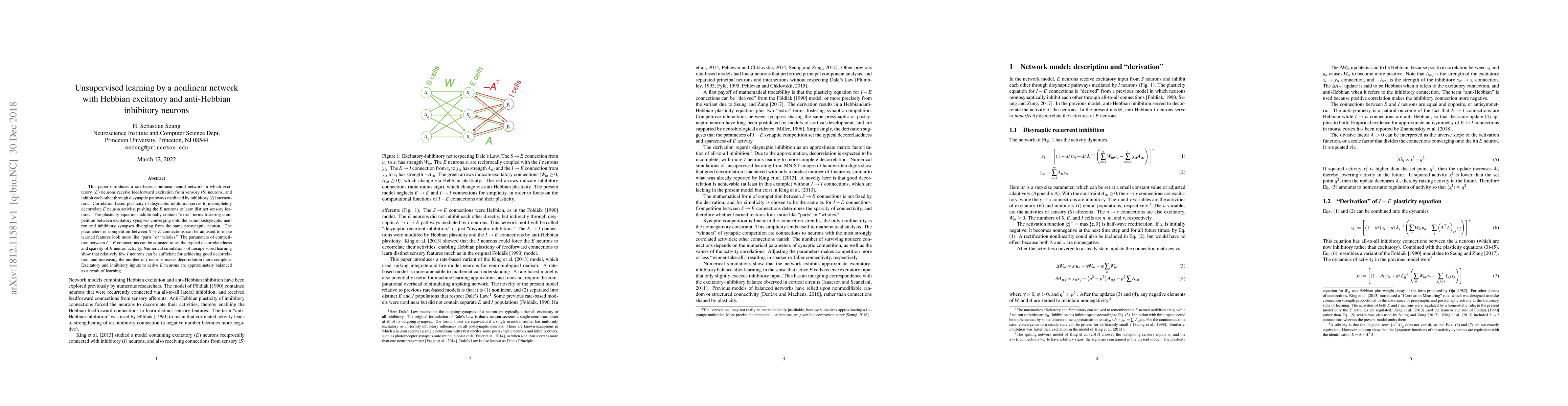 This paper introduces a rate-based nonlinear neural network in which excitatory (E) neurons receive feedforward excitation from sensory (S) neurons, and inhibit each other through disynaptic pathways mediated by inhibitory (I) interneurons. Correlation-based plasticity of disynaptic inhibition serves to incompletely decorrelate E neuron activity, pushing the E neurons to learn distinct sensory features. The plasticity equations additionally contain "extra" terms fostering competition between excitatory synapses converging onto the same postsynaptic neuron and inhibitory synapses diverging from the same presynaptic neuron. The parameters of competition between S$\to$E connections can be adjusted to make learned features look more like "parts" or "wholes." The parameters of competition between I-E connections can be adjusted to set the typical decorrelatedness and sparsity of E neuron activity. Numerical simulations of unsupervised learning show that relatively few I neurons can be sufficient for achieving good decorrelation, and increasing the number of I neurons makes decorrelation more complete. Excitatory and inhibitory inputs to active E neurons are approximately balanced as a result of learning.