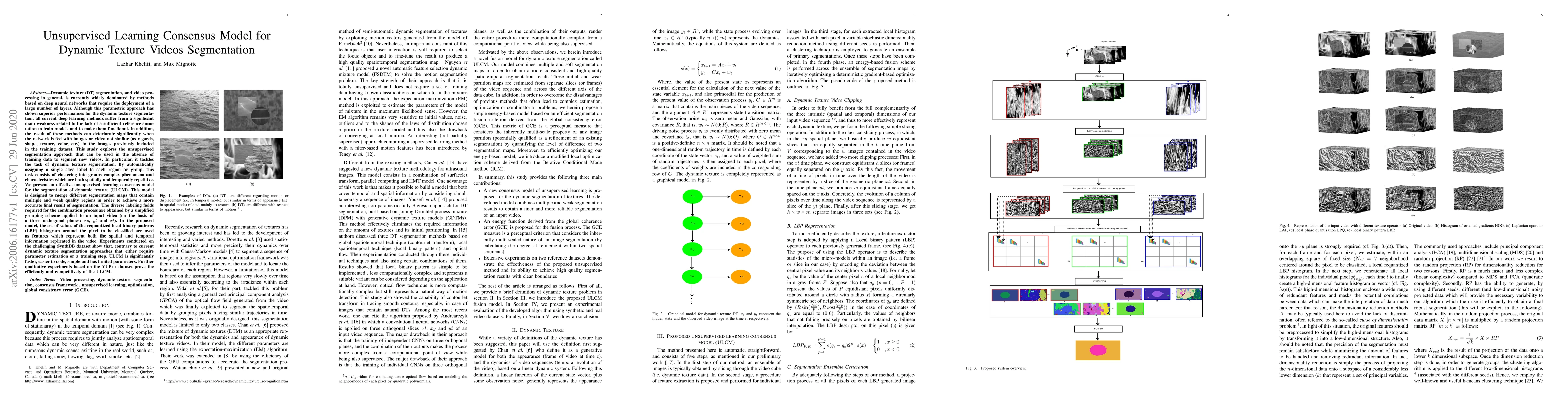 This paper proposes an unsupervised learning consensus model (ULCM) for dynamic texture segmentation in videos, which merges multiple segmentation maps to achieve accurate results without requiring training data. The model uses requantized local binary patterns (LBP) to capture spatial and temporal information, demonstrating faster performance and simplicity compared to supervised deep learning methods.