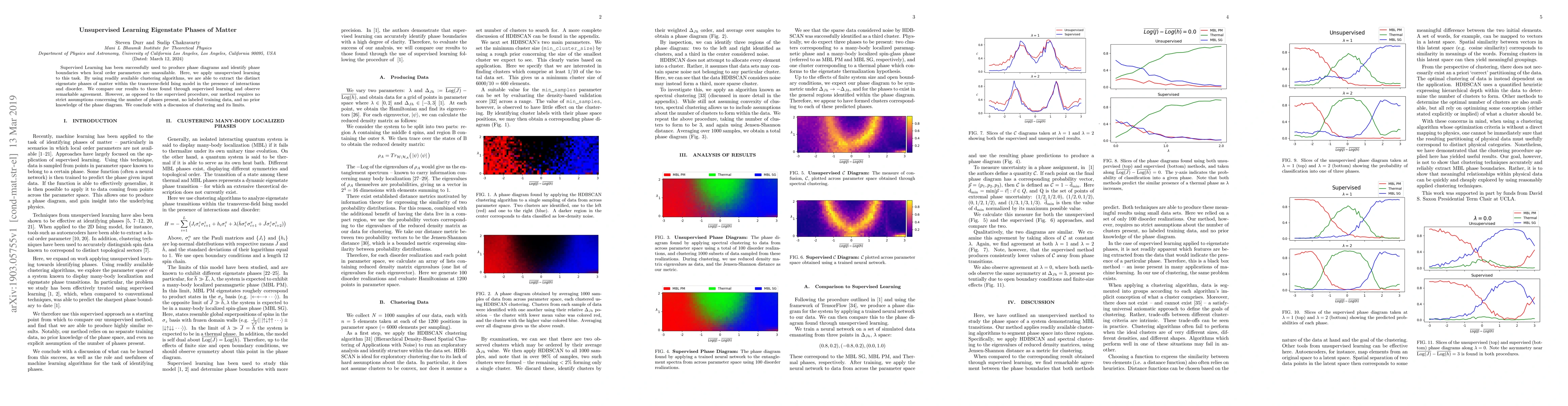 Supervised Learning has been successfully used to produce phase diagrams and identify phase boundaries when local order parameters are unavailable. Here, we apply unsupervised learning to this task. By using readily available clustering algorithms, we are able to extract the distinct eigenstate phases of matter within the transverse-field Ising model in the presence of interactions and disorder. We compare our results to those found through supervised learning and observe remarkable agreement. However, as opposed to the supervised procedure, our method requires no strict assumptions concerning the number of phases present, no labeled training data, and no prior knowledge of the phase diagram. We conclude with a discussion of clustering and its limits.