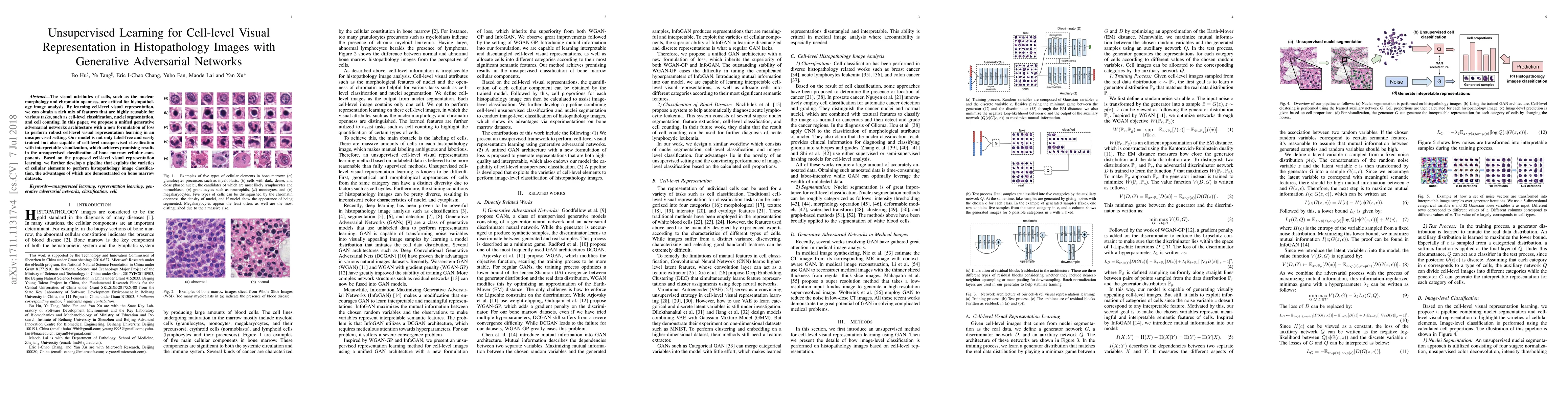 This paper proposes an unsupervised learning method using generative adversarial networks (GANs) to extract cell-level visual representations from histopathology images, enabling tasks like classification, segmentation, and counting without labeled data. The approach achieves robust, label-free classification of bone marrow components and demonstrates its utility in broader histopathology image classification.