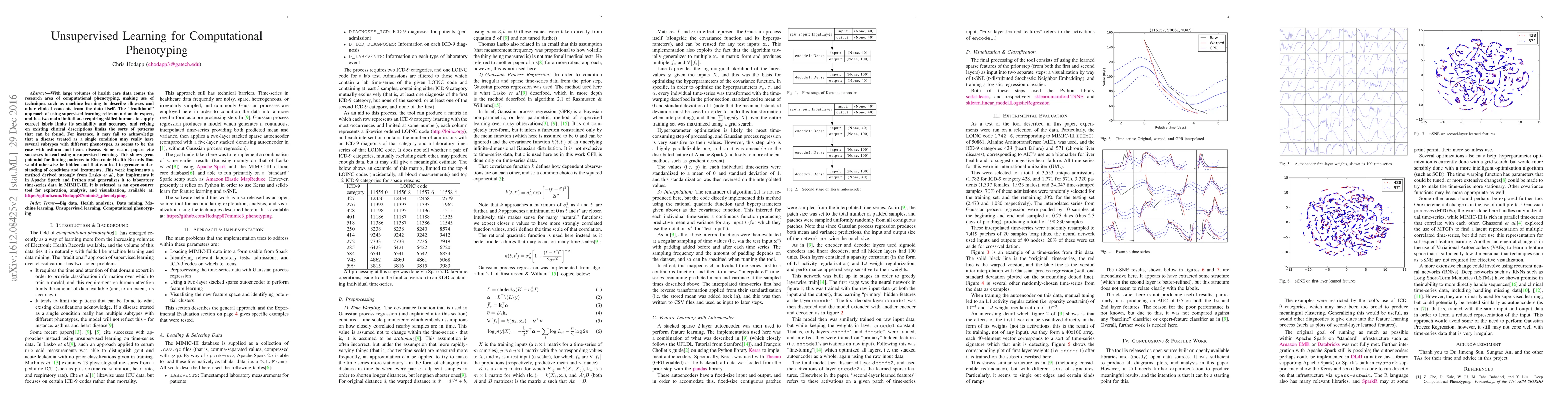 With large volumes of health care data comes the research area of computational phenotyping, making use of techniques such as machine learning to describe illnesses and other clinical concepts from the data itself. The "traditional" approach of using supervised learning relies on a domain expert, and has two main limitations: requiring skilled humans to supply correct labels limits its scalability and accuracy, and relying on existing clinical descriptions limits the sorts of patterns that can be found. For instance, it may fail to acknowledge that a disease treated as a single condition may really have several subtypes with different phenotypes, as seems to be the case with asthma and heart disease. Some recent papers cite successes instead using unsupervised learning. This shows great potential for finding patterns in Electronic Health Records that would otherwise be hidden and that can lead to greater understanding of conditions and treatments. This work implements a method derived strongly from Lasko et al., but implements it in Apache Spark and Python and generalizes it to laboratory time-series data in MIMIC-III. It is released as an open-source tool for exploration, analysis, and visualization, available at https://github.com/Hodapp87/mimic3_phenotyping