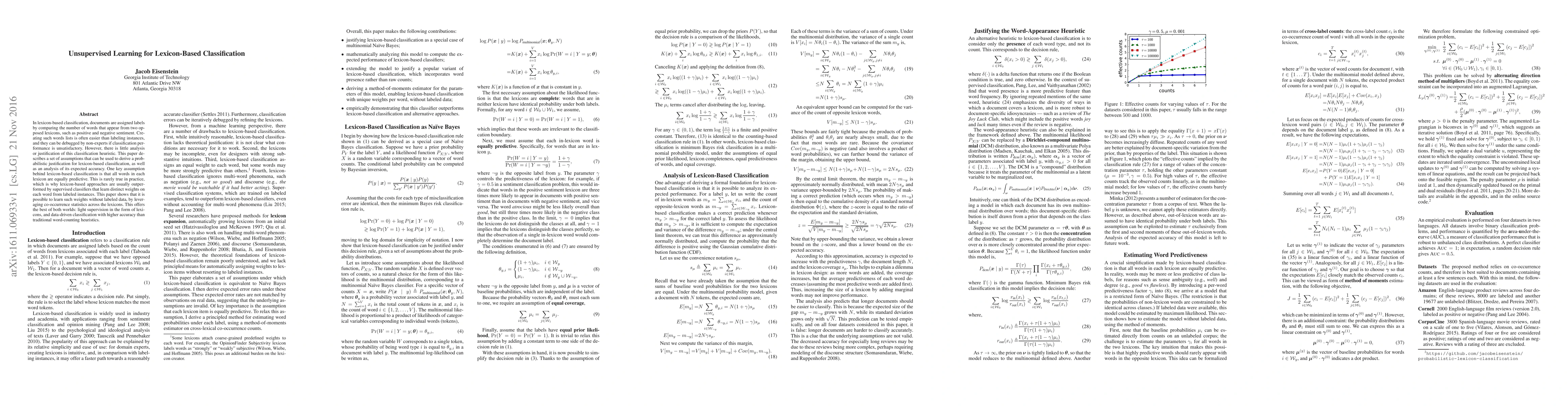 This paper proposes a method for unsupervised learning to improve lexicon-based classification by deriving a probabilistic justification and learning word weights from co-occurrence statistics, achieving higher accuracy than traditional word-counting heuristics.