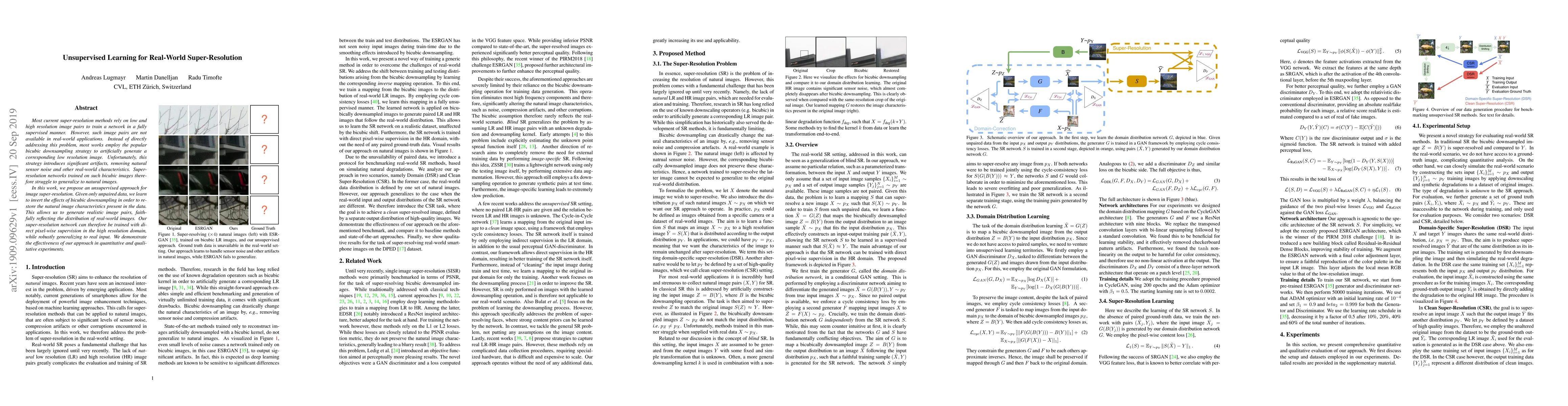 This paper proposes an unsupervised method for real-world image super-resolution, leveraging unpaired data to invert bicubic downsampling effects and restore natural image characteristics, enabling effective training with pixel-wise supervision and robust generalization to real inputs. The approach demonstrates improved performance in both quantitative and qualitative evaluations.