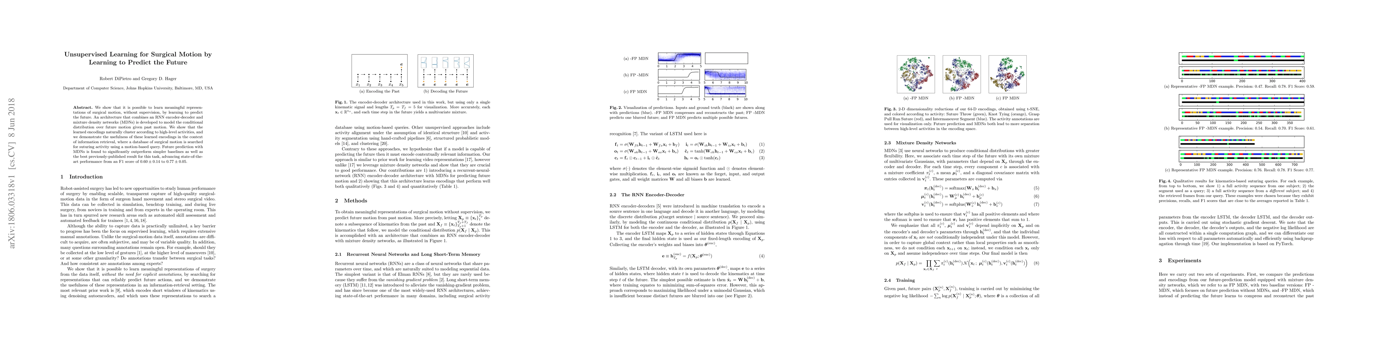 This paper presents an unsupervised learning method for surgical motion analysis using an RNN encoder-decoder and mixture density networks to predict future motion from past data. The learned representations cluster by high-level activities, improving information retrieval for surgical motion databases.