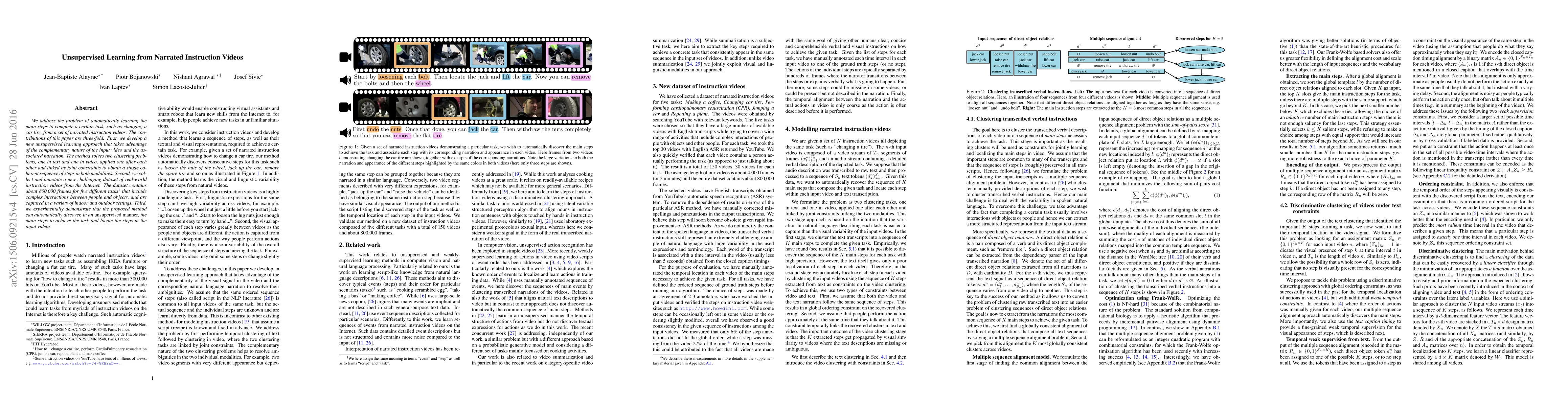 This paper introduces an unsupervised learning method to extract main task steps from narrated instruction videos by leveraging both video and narration. It also presents a new dataset of real-world instruction videos and demonstrates the method's effectiveness in discovering task steps without supervision.