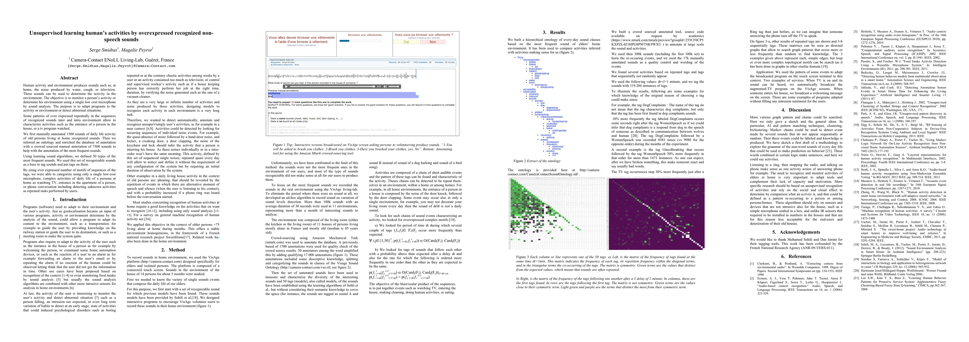 Human activity and environment produces sounds such as, at home, the noise produced by water, cough, or television. These sounds can be used to determine the activity in the environment. The objective is to monitor a person's activity or determine his environment using a single low cost microphone by sound analysis. The purpose is to adapt programs to the activity or environment or detect abnormal situations. Some patterns of over expressed repeatedly in the sequences of recognized sounds inter and intra environment allow to characterize activities such as the entrance of a person in the house, or a tv program watched. We first manually annotated 1500 sounds of daily life activity of old persons living at home recognized sounds. Then we inferred an ontology and enriched the database of annotation with a crowed sourced manual annotation of 7500 sounds to help with the annotation of the most frequent sounds. Using learning sound algorithms, we defined 50 types of the most frequent sounds. We used this set of recognizable sounds as a base to tag sounds and put tags on them. By using over expressed number of motifs of sequences of the tags, we were able to categorize using only a single low-cost microphone, complex activities of daily life of a persona at home as watching TV, entrance in the apartment of a person, or phone conversation including detecting unknown activities as repeated tasks performed by users.