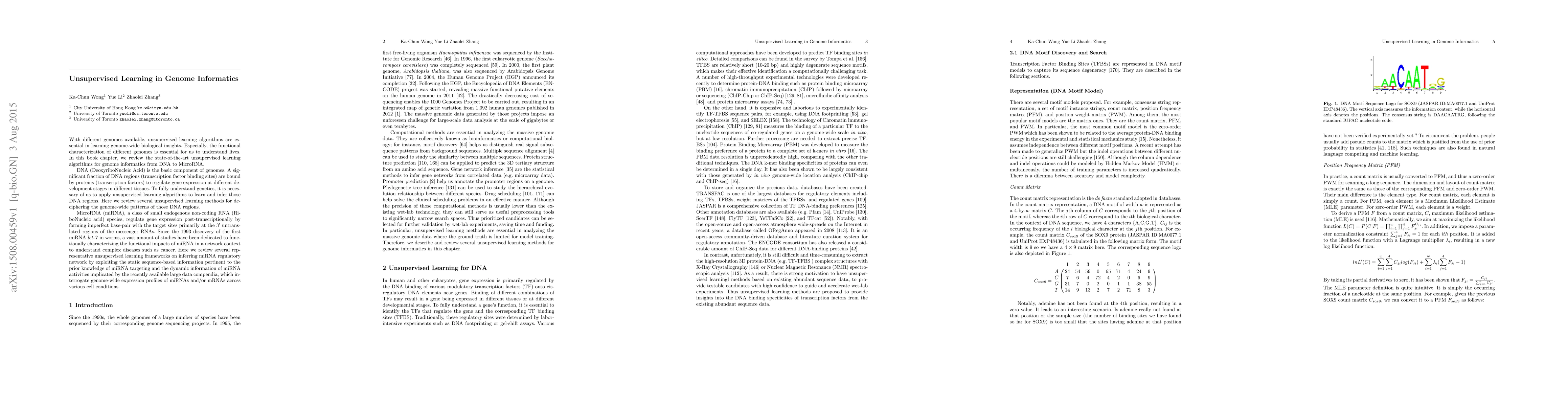 With different genomes available, unsupervised learning algorithms are essential in learning genome-wide biological insights. Especially, the functional characterization of different genomes is essential for us to understand lives. In this book chapter, we review the state-of-the-art unsupervised learning algorithms for genome informatics from DNA to MicroRNA. DNA (DeoxyriboNucleic Acid) is the basic component of genomes. A significant fraction of DNA regions (transcription factor binding sites) are bound by proteins (transcription factors) to regulate gene expression at different development stages in different tissues. To fully understand genetics, it is necessary of us to apply unsupervised learning algorithms to learn and infer those DNA regions. Here we review several unsupervised learning methods for deciphering the genome-wide patterns of those DNA regions. MicroRNA (miRNA), a class of small endogenous non-coding RNA (RiboNucleic acid) species, regulate gene expression post-transcriptionally by forming imperfect base-pair with the target sites primarily at the 3$'$ untranslated regions of the messenger RNAs. Since the 1993 discovery of the first miRNA \emph{let-7} in worms, a vast amount of studies have been dedicated to functionally characterizing the functional impacts of miRNA in a network context to understand complex diseases such as cancer. Here we review several representative unsupervised learning frameworks on inferring miRNA regulatory network by exploiting the static sequence-based information pertinent to the prior knowledge of miRNA targeting and the dynamic information of miRNA activities implicated by the recently available large data compendia, which interrogate genome-wide expression profiles of miRNAs and/or mRNAs across various cell conditions.