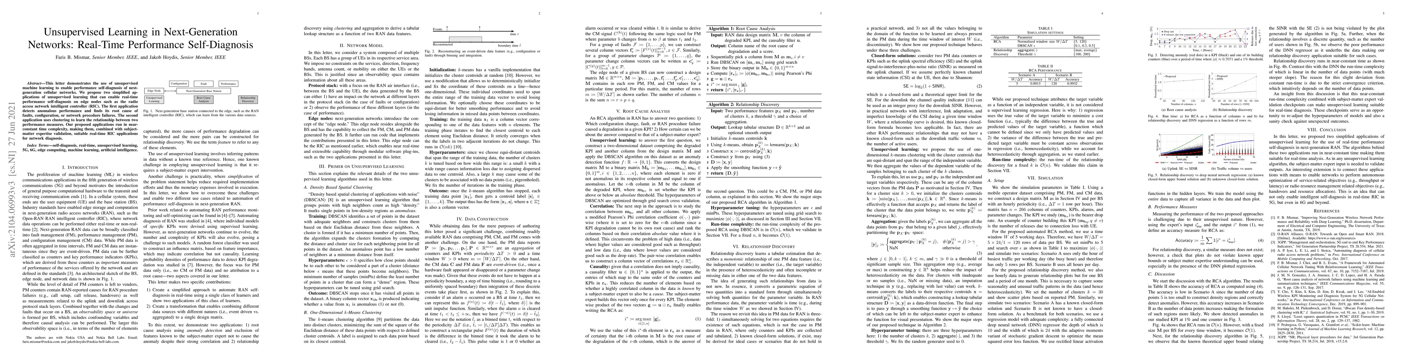 This paper proposes unsupervised machine learning techniques for real-time self-diagnosis in next-generation cellular networks, focusing on edge nodes like the RIC. It introduces two applications: one for detecting and diagnosing performance anomalies, and another for clustering performance measures to uncover relationships.