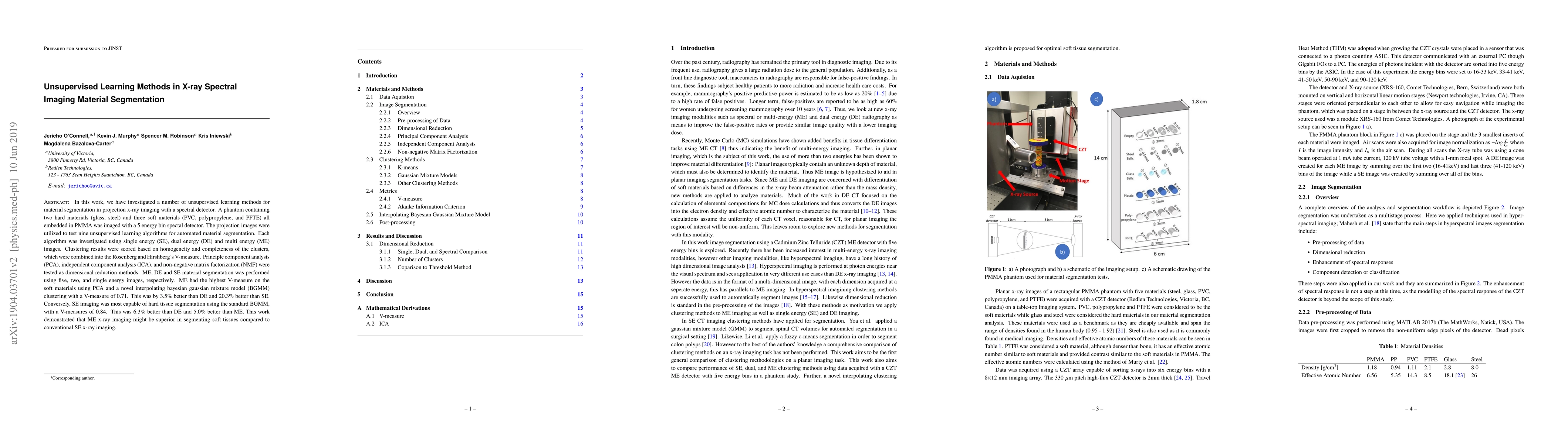 This research paper explores unsupervised learning methods for segmenting materials in X-ray spectral imaging, finding that multi-energy images outperform single-energy images in segmenting soft tissues, with a 20.3% advantage over single-energy imaging.