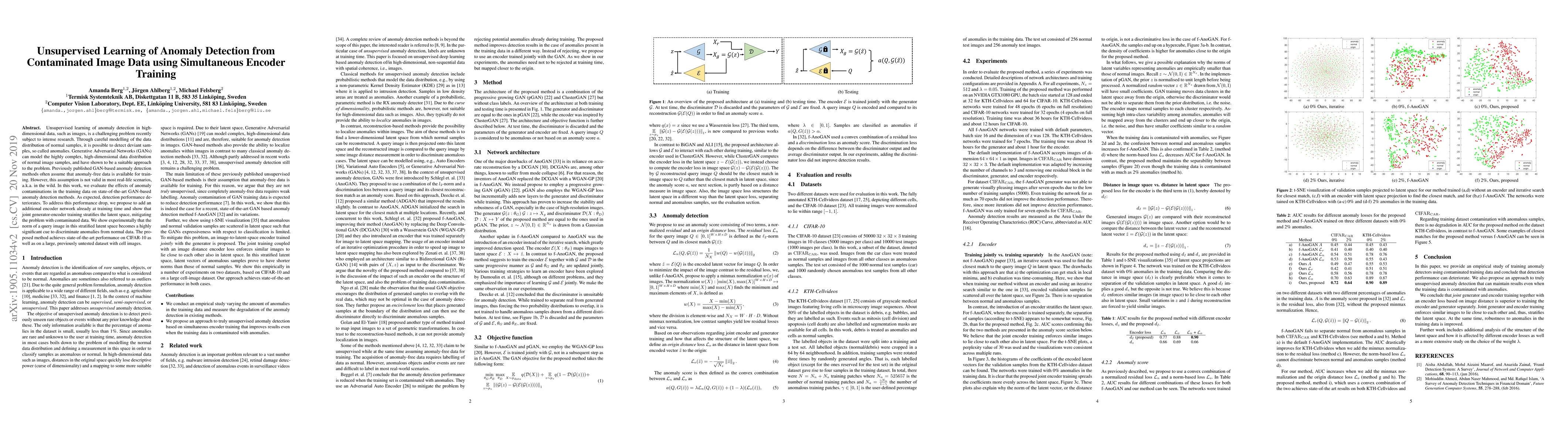 This paper proposes an unsupervised anomaly detection method using GANs that incorporates an additional encoder network during training to mitigate the effects of contaminated training data. The joint training of the generator and encoder stratifies the latent space, significantly improving anomaly detection performance on CIFAR-10 and a new cell image dataset.