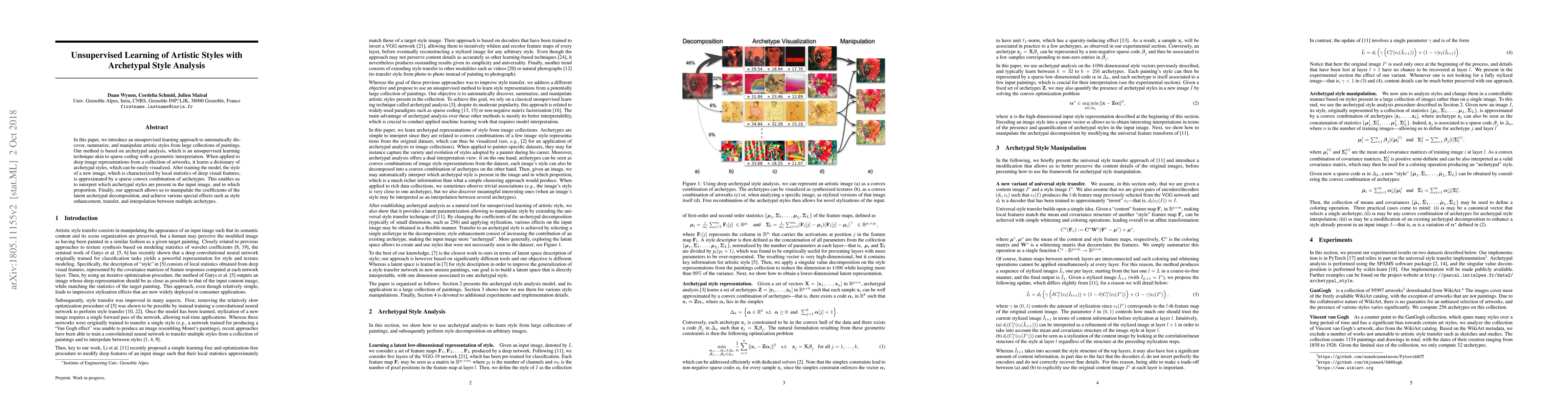 This paper presents an unsupervised learning method using archetypal analysis to identify and manipulate artistic styles from large collections of paintings. The technique learns a dictionary of archetypal styles from deep image representations, enabling style transfer, enhancement, and interpolation.