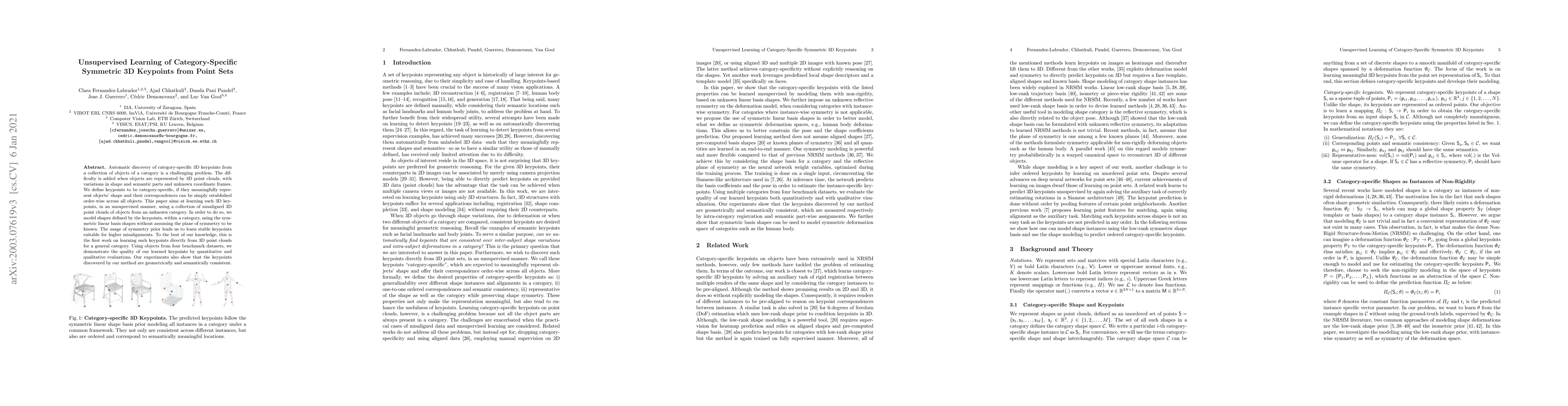 The paper presents an unsupervised learning method for discovering category-specific 3D keypoints from misaligned 3D point clouds using symmetric linear basis shapes. It models shapes within a category without assuming a known plane of symmetry, leading to stable keypoints suitable for higher misalignments.