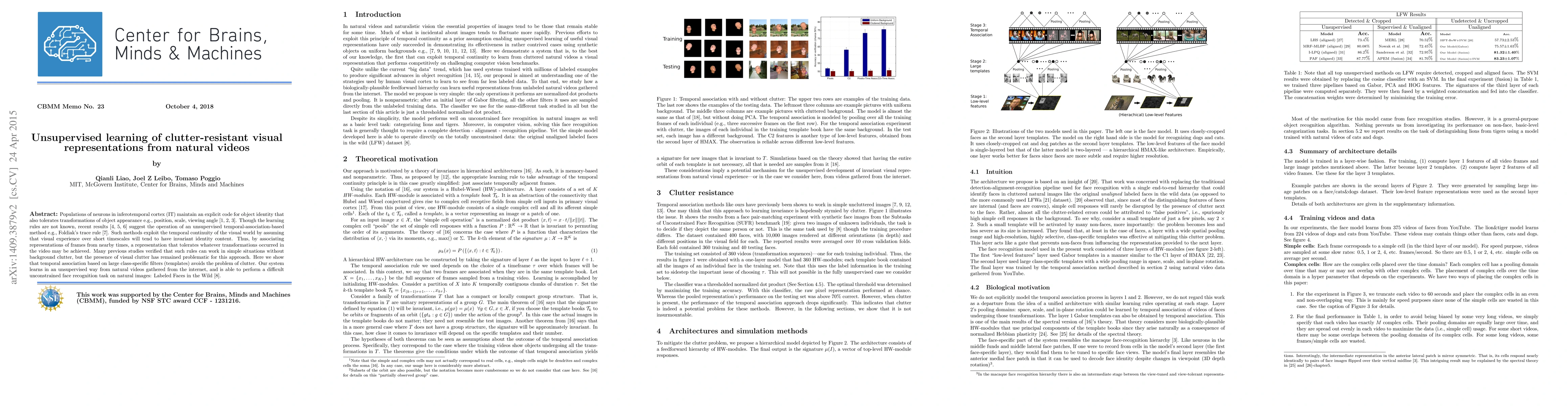 This paper presents an unsupervised learning method using temporal association and class-specific filters to develop clutter-resistant visual representations from natural videos, demonstrating its effectiveness in unconstrained face recognition.