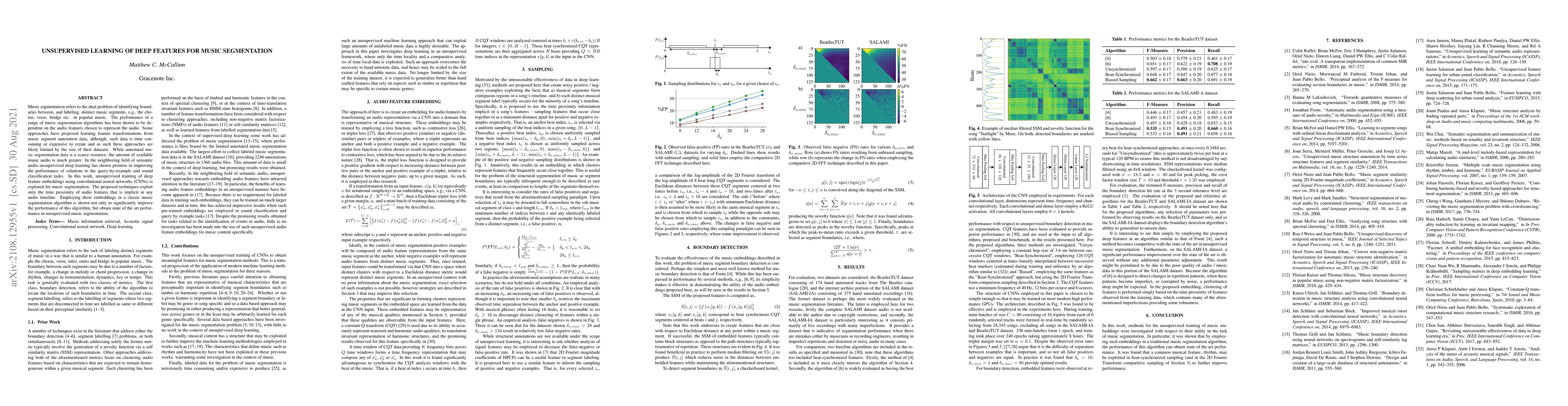 This paper explores unsupervised deep learning techniques using convolutional neural networks (CNNs) to extract features for music segmentation without relying on annotated data. The approach achieves state-of-the-art performance in unsupervised music segmentation by leveraging only the temporal proximity of audio features.