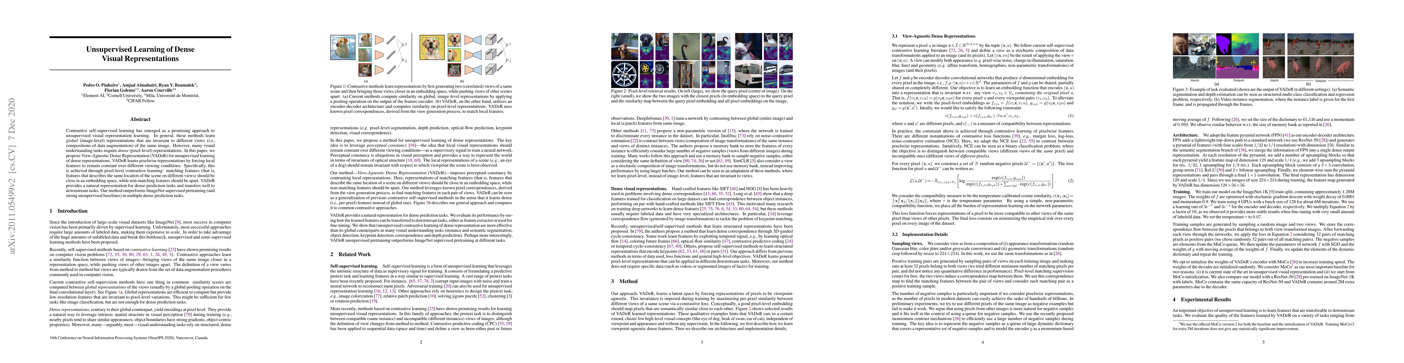 The paper proposes View-Agnostic Dense Representation (VADeR) for unsupervised learning of dense visual representations through pixel-level contrastive learning. VADeR forces local features to remain constant over different viewing conditions by matching features describing the same location on different views in an embedding space.