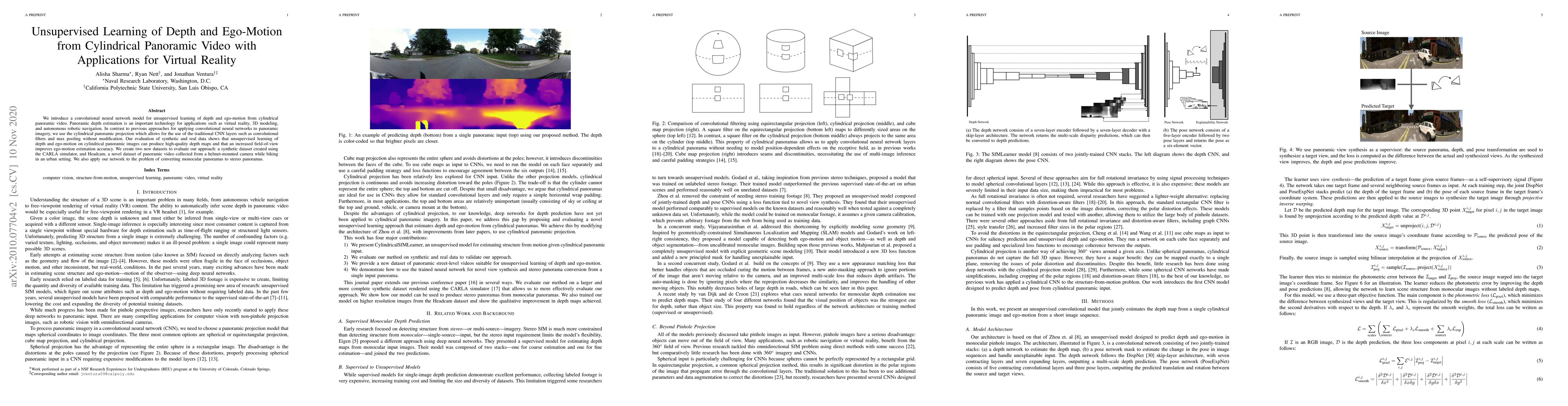 This paper presents a convolutional neural network for unsupervised learning of depth and ego-motion from cylindrical panoramic video, demonstrating high-quality depth maps and improved ego-motion estimation, with applications in virtual reality and autonomous navigation. Two new datasets, CARLA and Headcam, are introduced for evaluation.