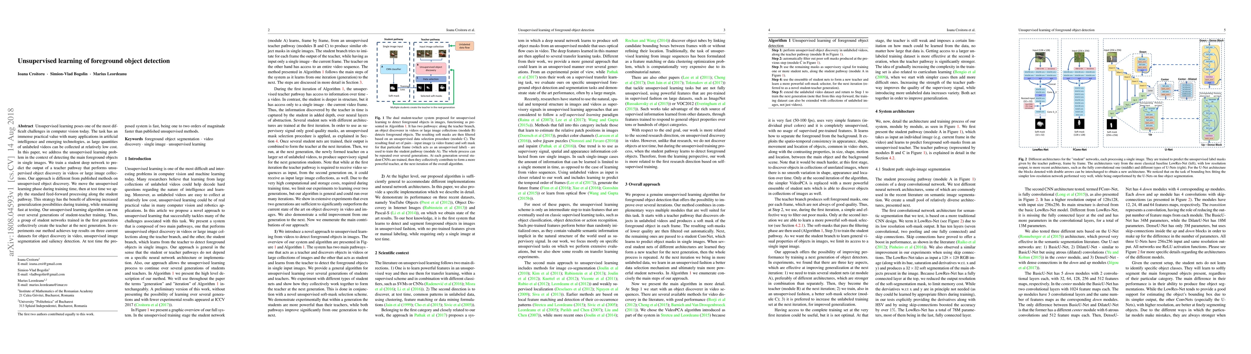 Unsupervised learning poses one of the most difficult challenges in computer vision today. The task has an immense practical value with many applications in artificial intelligence and emerging technologies, as large quantities of unlabeled videos can be collected at relatively low cost. In this paper, we address the unsupervised learning problem in the context of detecting the main foreground objects in single images. We train a student deep network to predict the output of a teacher pathway that performs unsupervised object discovery in videos or large image collections. Our approach is different from published methods on unsupervised object discovery. We move the unsupervised learning phase during training time, then at test time we apply the standard feed-forward processing along the student pathway. This strategy has the benefit of allowing increased generalization possibilities during training, while remaining fast at testing. Our unsupervised learning algorithm can run over several generations of student-teacher training. Thus, a group of student networks trained in the first generation collectively create the teacher at the next generation. In experiments our method achieves top results on three current datasets for object discovery in video, unsupervised image segmentation and saliency detection. At test time the proposed system is fast, being one to two orders of magnitude faster than published unsupervised methods.