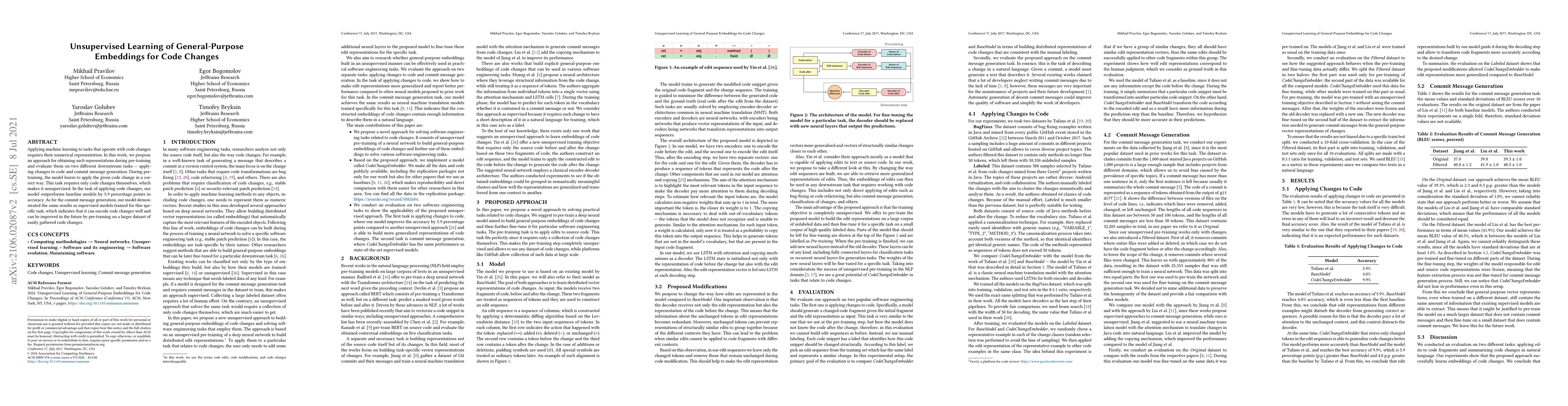 Applying machine learning to tasks that operate with code changes requires their numerical representation. In this work, we propose an approach for obtaining such representations during pre-training and evaluate them on two different downstream tasks - applying changes to code and commit message generation. During pre-training, the model learns to apply the given code change in a correct way. This task requires only code changes themselves, which makes it unsupervised. In the task of applying code changes, our model outperforms baseline models by 5.9 percentage points in accuracy. As for the commit message generation, our model demonstrated the same results as supervised models trained for this specific task, which indicates that it can encode code changes well and can be improved in the future by pre-training on a larger dataset of easily gathered code changes.