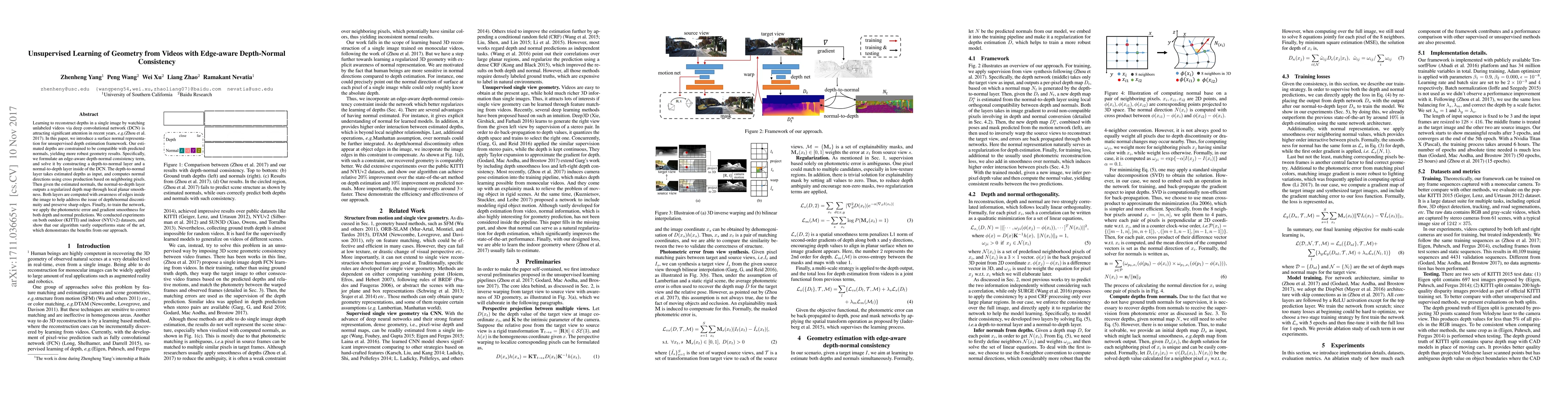 This paper proposes an unsupervised deep convolutional network for depth estimation from single images using unlabeled videos, incorporating edge-aware depth-normal consistency to enhance geometry reconstruction. The method uses depth-to-normal and normal-to-depth layers to ensure depth and normals are mutually consistent, achieving superior results on KITTI and NYUv2 datasets.