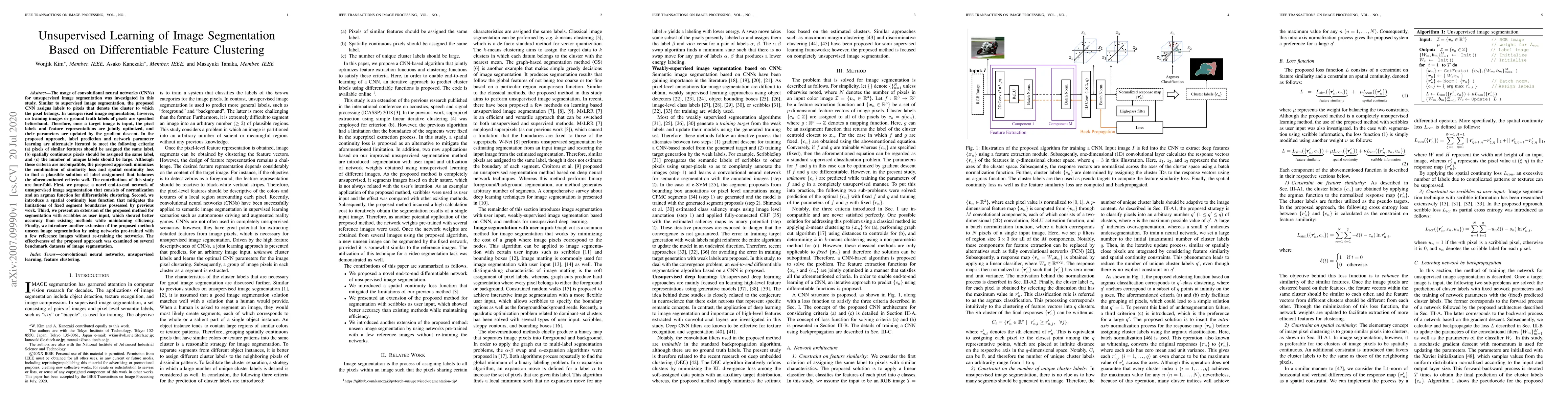 The usage of convolutional neural networks (CNNs) for unsupervised image segmentation was investigated in this study. In the proposed approach, label prediction and network parameter learning are alternately iterated to meet the following criteria: (a) pixels of similar features should be assigned the same label, (b) spatially continuous pixels should be assigned the same label, and (c) the number of unique labels should be large. Although these criteria are incompatible, the proposed approach minimizes the combination of similarity loss and spatial continuity loss to find a plausible solution of label assignment that balances the aforementioned criteria well. The contributions of this study are four-fold. First, we propose a novel end-to-end network of unsupervised image segmentation that consists of normalization and an argmax function for differentiable clustering. Second, we introduce a spatial continuity loss function that mitigates the limitations of fixed segment boundaries possessed by previous work. Third, we present an extension of the proposed method for segmentation with scribbles as user input, which showed better accuracy than existing methods while maintaining efficiency. Finally, we introduce another extension of the proposed method: unseen image segmentation by using networks pre-trained with a few reference images without re-training the networks. The effectiveness of the proposed approach was examined on several benchmark datasets of image segmentation.