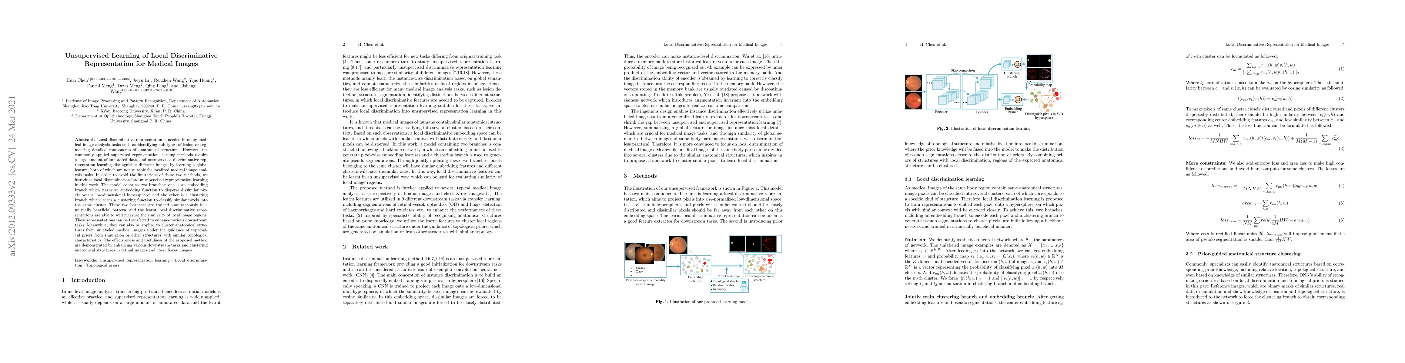 This paper proposes an unsupervised learning method to develop local discriminative representations for medical images, addressing the limitations of supervised and global feature-based unsupervised methods. It employs two branches to learn embeddings and clustering functions, which are trained together to enhance localized analysis tasks and downstream applications.