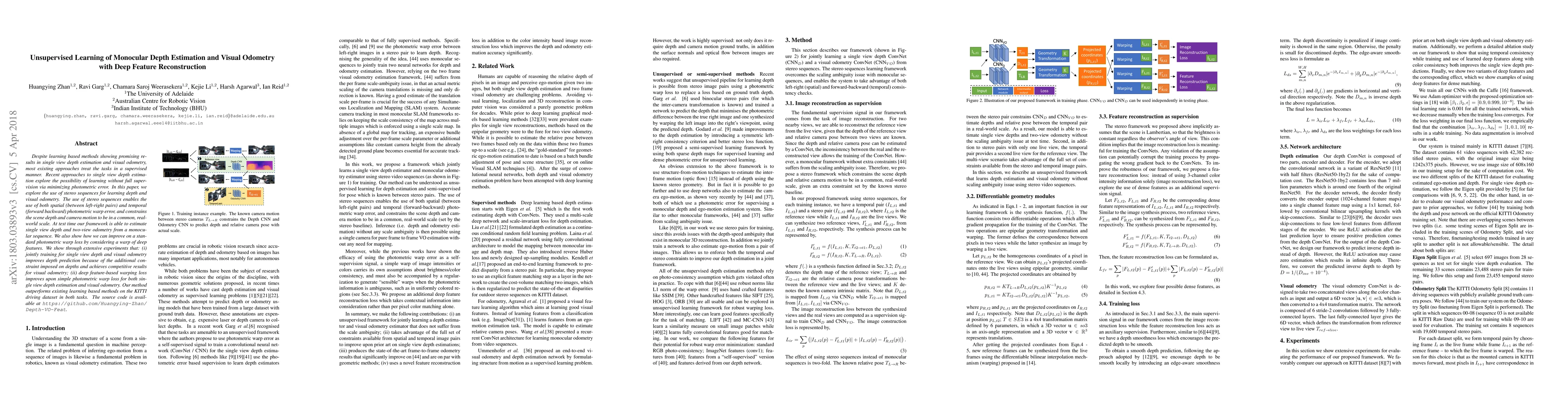 This paper proposes an unsupervised learning approach for monocular depth estimation and visual odometry using stereo sequences to leverage spatial and temporal photometric errors. By incorporating deep feature reconstruction, the method achieves improved depth prediction and visual odometry performance compared to supervised methods, outperforming existing techniques on the KITTI dataset.