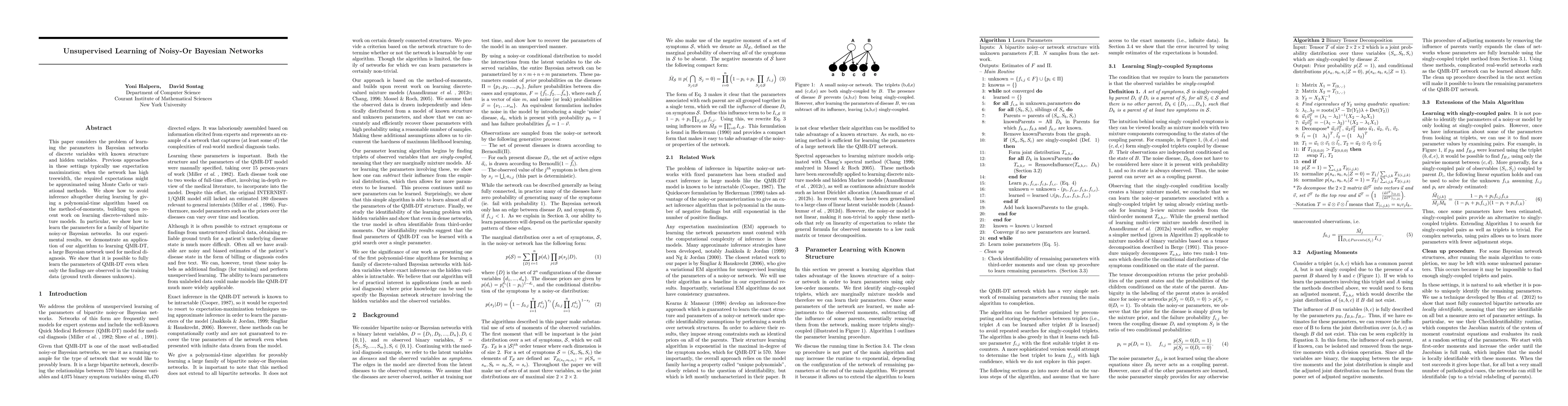 This paper presents a polynomial-time algorithm based on the method-of-moments to learn parameters in noisy-or Bayesian networks without requiring inference, demonstrating its application to learning QMR-DT for medical diagnosis using only observed findings.