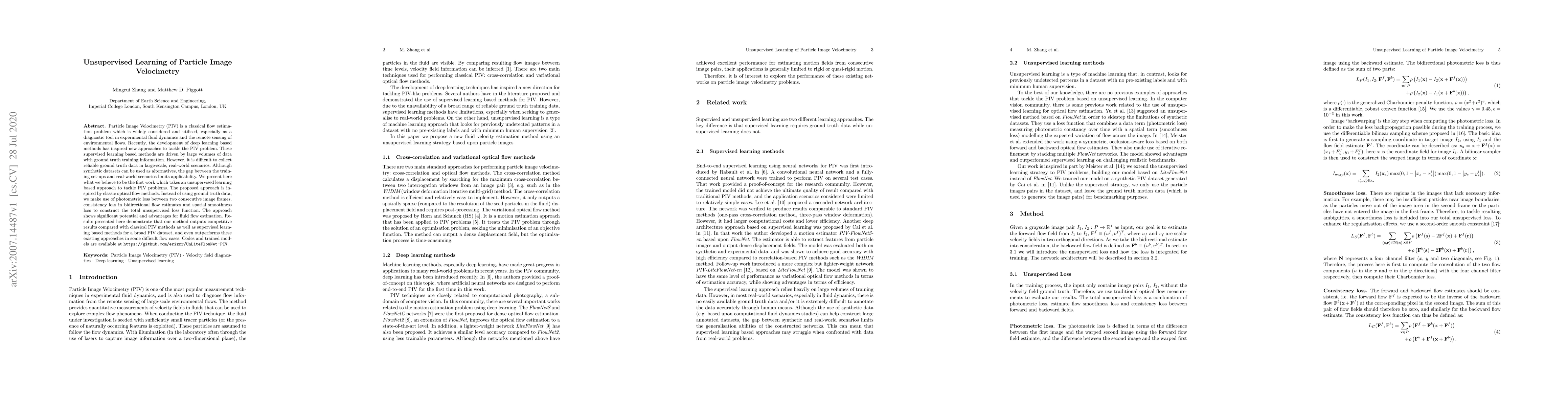 Particle Image Velocimetry (PIV) is a classical flow estimation problem which is widely considered and utilised, especially as a diagnostic tool in experimental fluid dynamics and the remote sensing of environmental flows. Recently, the development of deep learning based methods has inspired new approaches to tackle the PIV problem. These supervised learning based methods are driven by large volumes of data with ground truth training information. However, it is difficult to collect reliable ground truth data in large-scale, real-world scenarios. Although synthetic datasets can be used as alternatives, the gap between the training set-ups and real-world scenarios limits applicability. We present here what we believe to be the first work which takes an unsupervised learning based approach to tackle PIV problems. The proposed approach is inspired by classic optical flow methods. Instead of using ground truth data, we make use of photometric loss between two consecutive image frames, consistency loss in bidirectional flow estimates and spatial smoothness loss to construct the total unsupervised loss function. The approach shows significant potential and advantages for fluid flow estimation. Results presented here demonstrate that our method outputs competitive results compared with classical PIV methods as well as supervised learning based methods for a broad PIV dataset, and even outperforms these existing approaches in some difficult flow cases. Codes and trained models are available at https://github.com/erizmr/UnLiteFlowNet-PIV.
