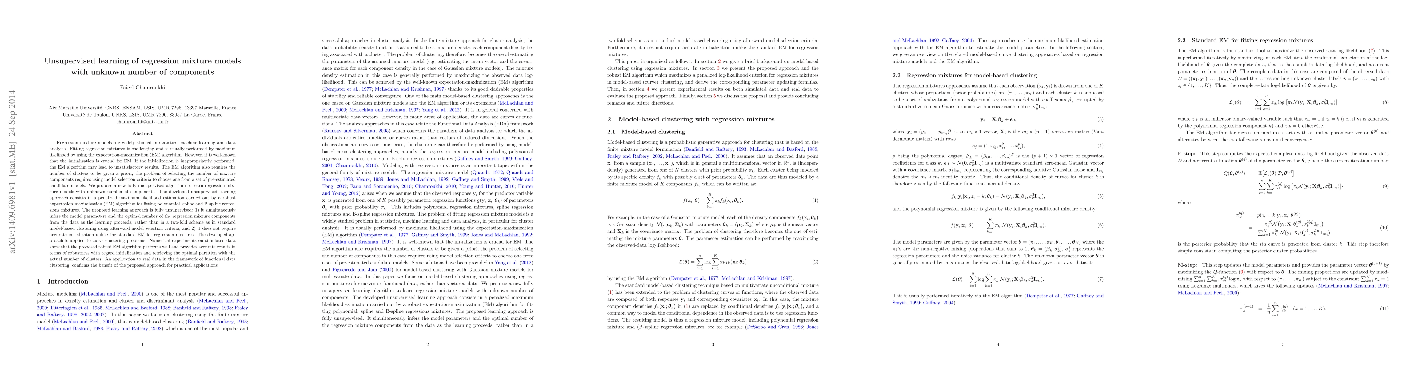 This paper proposes a fully unsupervised algorithm for learning regression mixture models without requiring the number of components to be specified in advance. The method uses a robust expectation-maximization algorithm for penalized maximum likelihood estimation, which simultaneously infers the optimal number of components and model parameters, demonstrating robustness and accuracy in both simulated and real data applications.