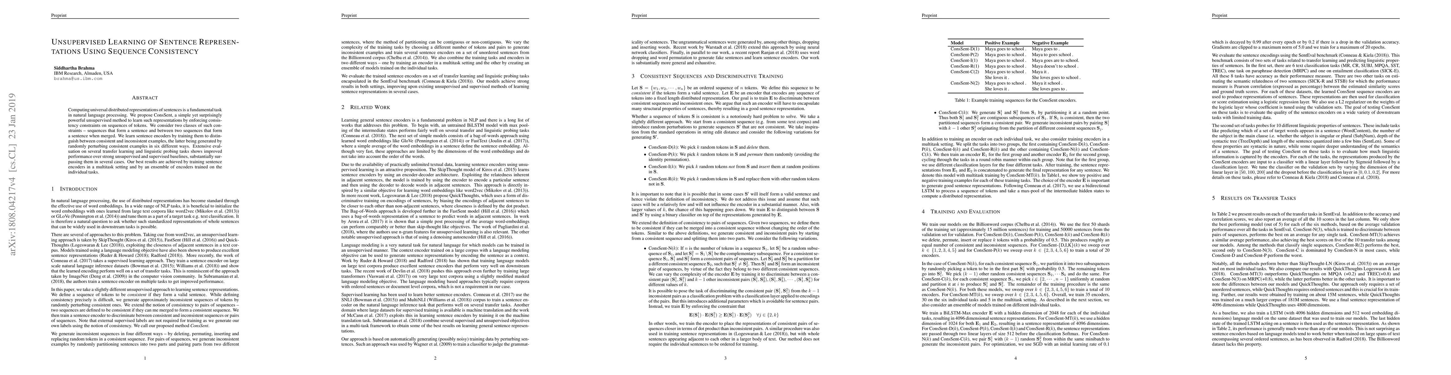 This paper introduces an unsupervised learning method, ConsSent, to generate sentence representations by enforcing sequence consistency constraints. The method outperforms both unsupervised and supervised baselines in various transfer learning and linguistic tasks, achieving the best results through multitask training and encoder ensembles.