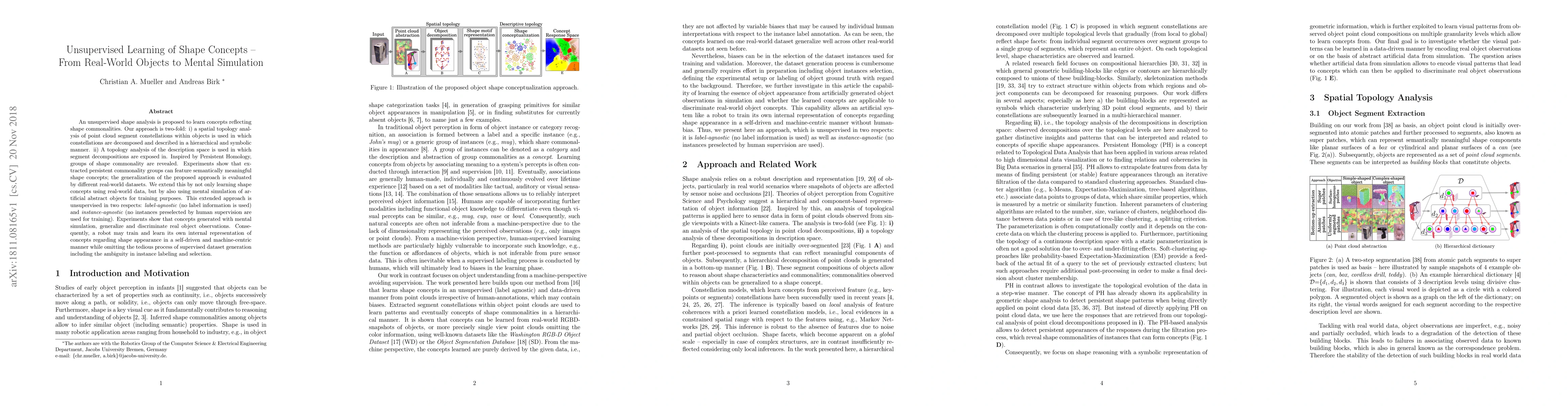 An unsupervised shape analysis is proposed to learn concepts reflecting shape commonalities. Our approach is two-fold: i) a spatial topology analysis of point cloud segment constellations within objects is used in which constellations are decomposed and described in a hierarchical and symbolic manner. ii) A topology analysis of the description space is used in which segment decompositions are exposed in. Inspired by Persistent Homology, groups of shape commonality are revealed. Experiments show that extracted persistent commonality groups can feature semantically meaningful shape concepts; the generalization of the proposed approach is evaluated by different real-world datasets. We extend this by not only learning shape concepts using real-world data, but by also using mental simulation of artificial abstract objects for training purposes. This extended approach is unsupervised in two respects: label-agnostic (no label information is used) and instance-agnostic (no instances preselected by human supervision are used for training). Experiments show that concepts generated with mental simulation, generalize and discriminate real object observations. Consequently, a robot may train and learn its own internal representation of concepts regarding shape appearance in a self-driven and machine-centric manner while omitting the tedious process of supervised dataset generation including the ambiguity in instance labeling and selection.